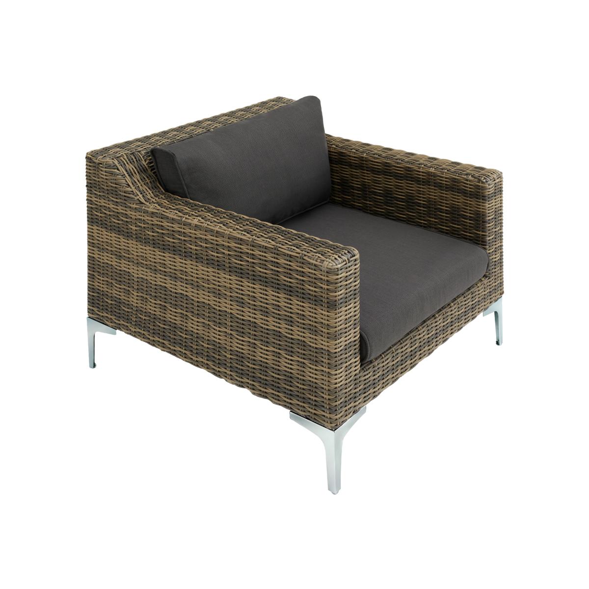 With its appealing design, this comfortable armchair from the modular rattan garden furniture Villanova range by tectake draws everyone's attention. The hallmark of the generously designed lounge furniture is the high-quality polyrattan pattern, which is based on natural wickerwork, however is more durable and weather-resistant than real wicker. The chair features thick upholstery with colour-coordinated covers which offers an extremely comfortable sitting experience. The armchair can be combined with other armchairs, chairs and sets from the Villanova range to create a dining or sofa set, to suit your available outdoor space.