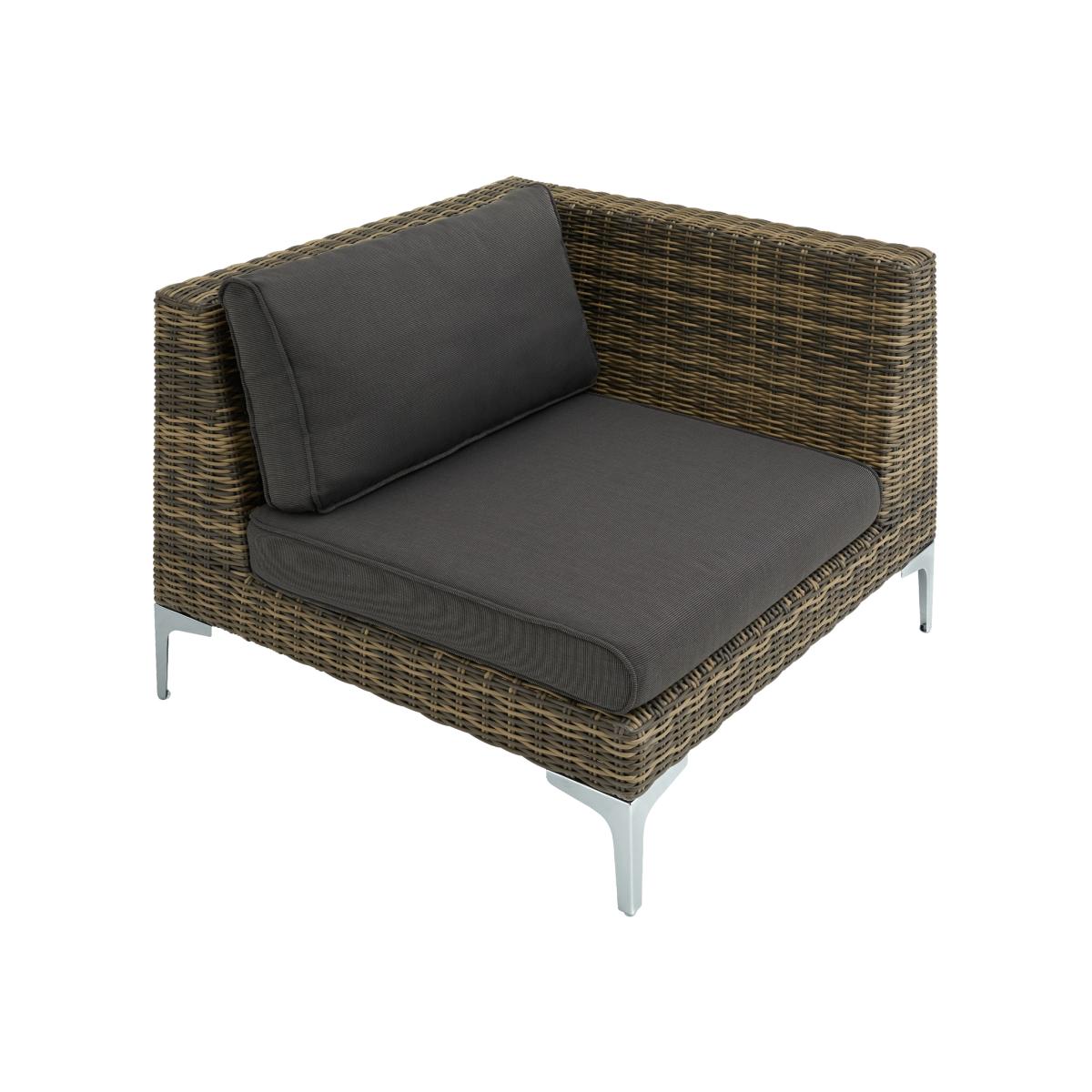 Anyone who appreciates cosiness and a well thought-out design will be impressed by the large corner armchair of the modular Villanova rattan garden furniture from tectake. The chairs upholstery, which is as thick as it is soft, adapts gently to the body and conveys a relaxed feeling of well-being that lets you forget the stress of everyday life. The outdoor furniture is characterised by the high-quality weave, which not only impresses with its attractive, natural appearance, but also with its high durability. The light aluminum frame and four solid legs with floor-protecting plastic cap accessories provide high stability and resilience, making it perfect for use outdoors but also in your kitchen or living room. Combine this stylish corner chair with other products from the Villanova range to create the perfect lounge or dining set for your home. from tectake.