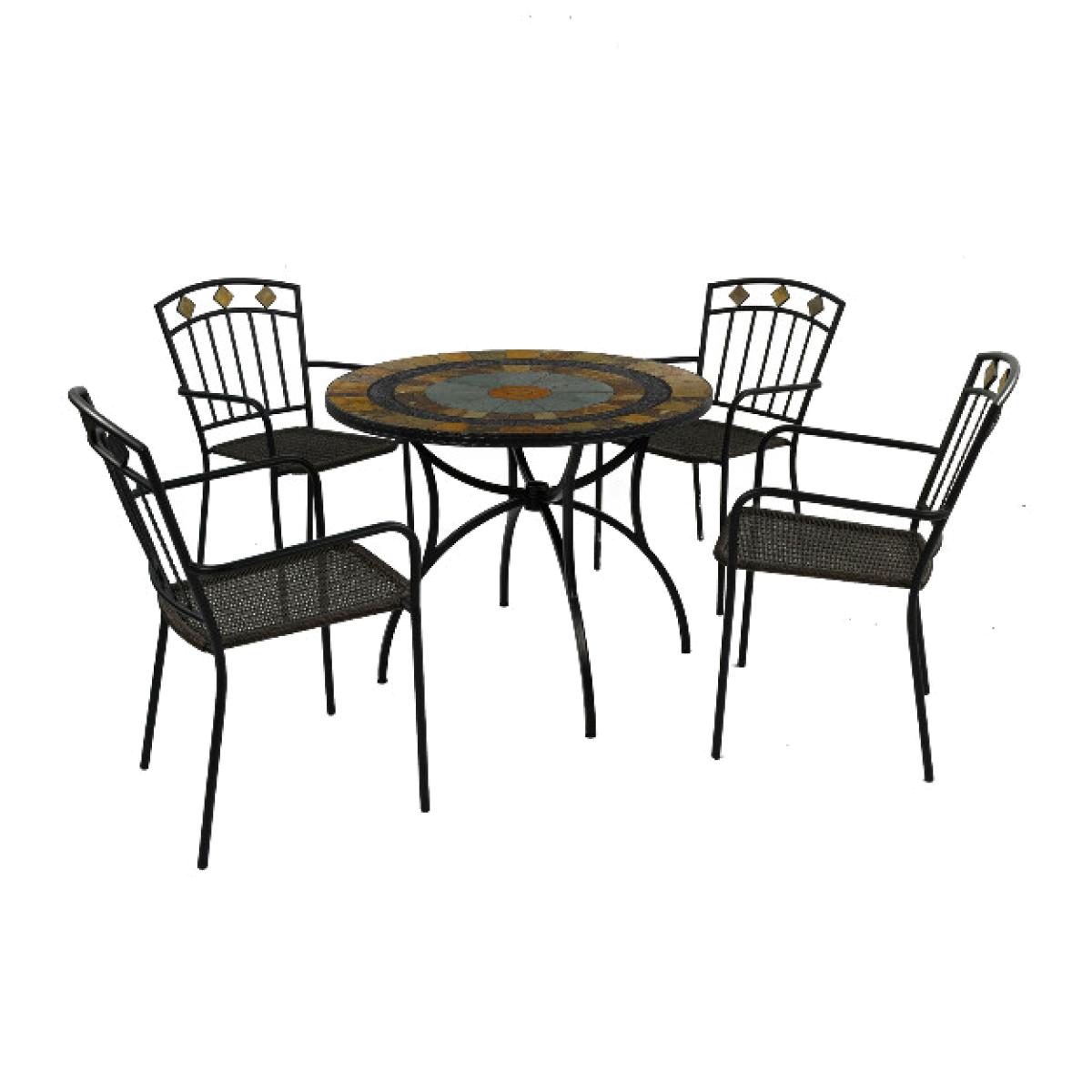 I love this patio set because it effortlessly combines classic charm with durability, making it perfect for both relaxed outdoor dining and more polished alfresco entertaining. The Villena table with its bold, patterned top adds visual interest, while the Malaga chairs offer comfortable seating with a touch of vintage-inspired elegance. It's versatile enough to work in various settings, from garden terraces to urban patios, and pairs well with neutral tones or vibrant accessories to create a lively or understated look. Practical styling tips include adding weatherproof cushions for extra comfort, and grouping some greenery or string lighting nearby to complete a inviting outdoor space.