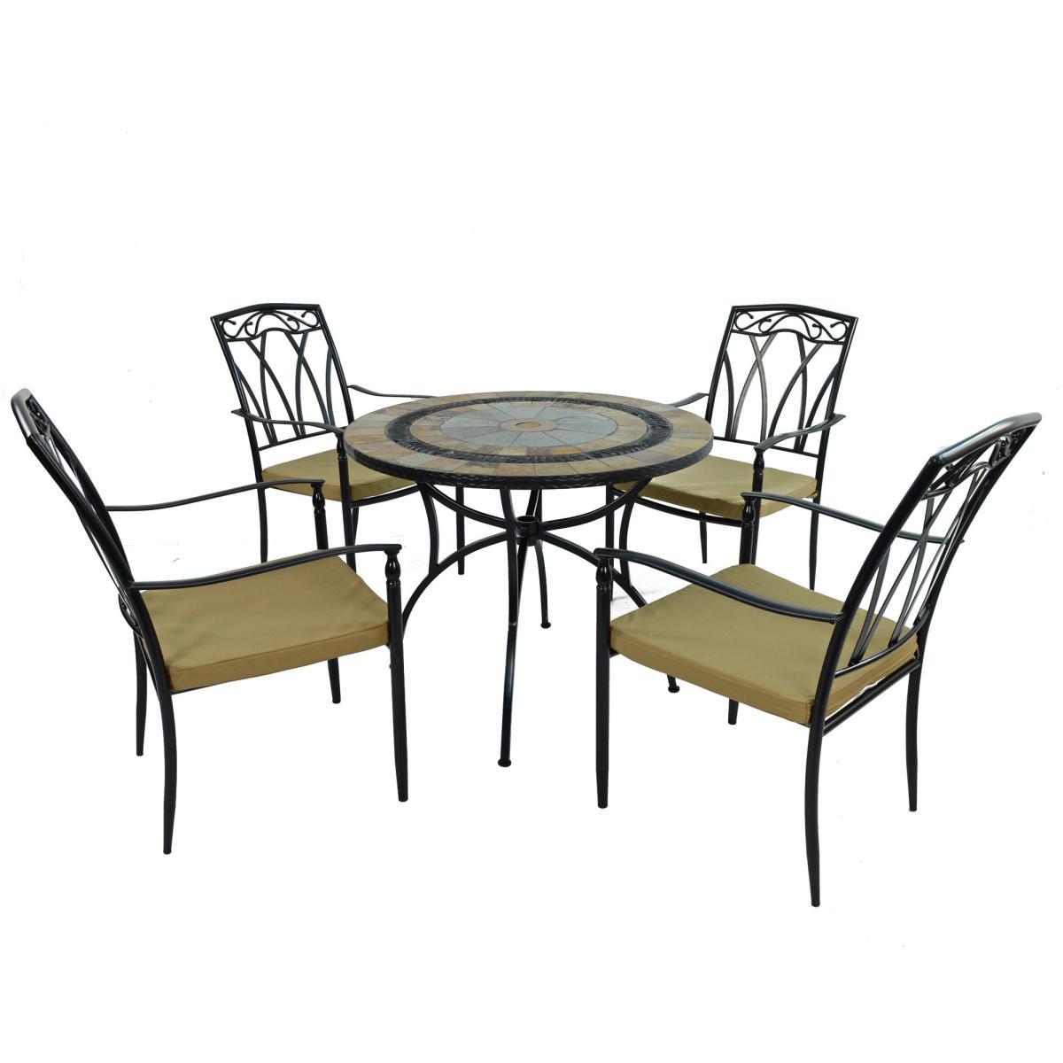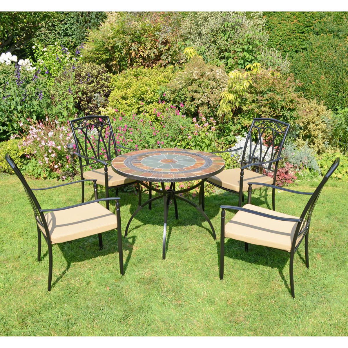 The Europa Leisure Villena Table is a beautiful 60cm round bistro table that will add a rustic charm to any garden setting. It is made with hand cut riven stone and slate mosaic, and the inclusion of a moulder embossed leaf design adds to the look. The table is made with steel legs which are powder coated black. The Ascot Chairs are deep-seated stacking chairs that have a robust frame and the decorative ornate backrest, they would look great alongside any grandiose table either indoors or outside. The chairs also include shower proof cushions with removable covers for added comfort.
