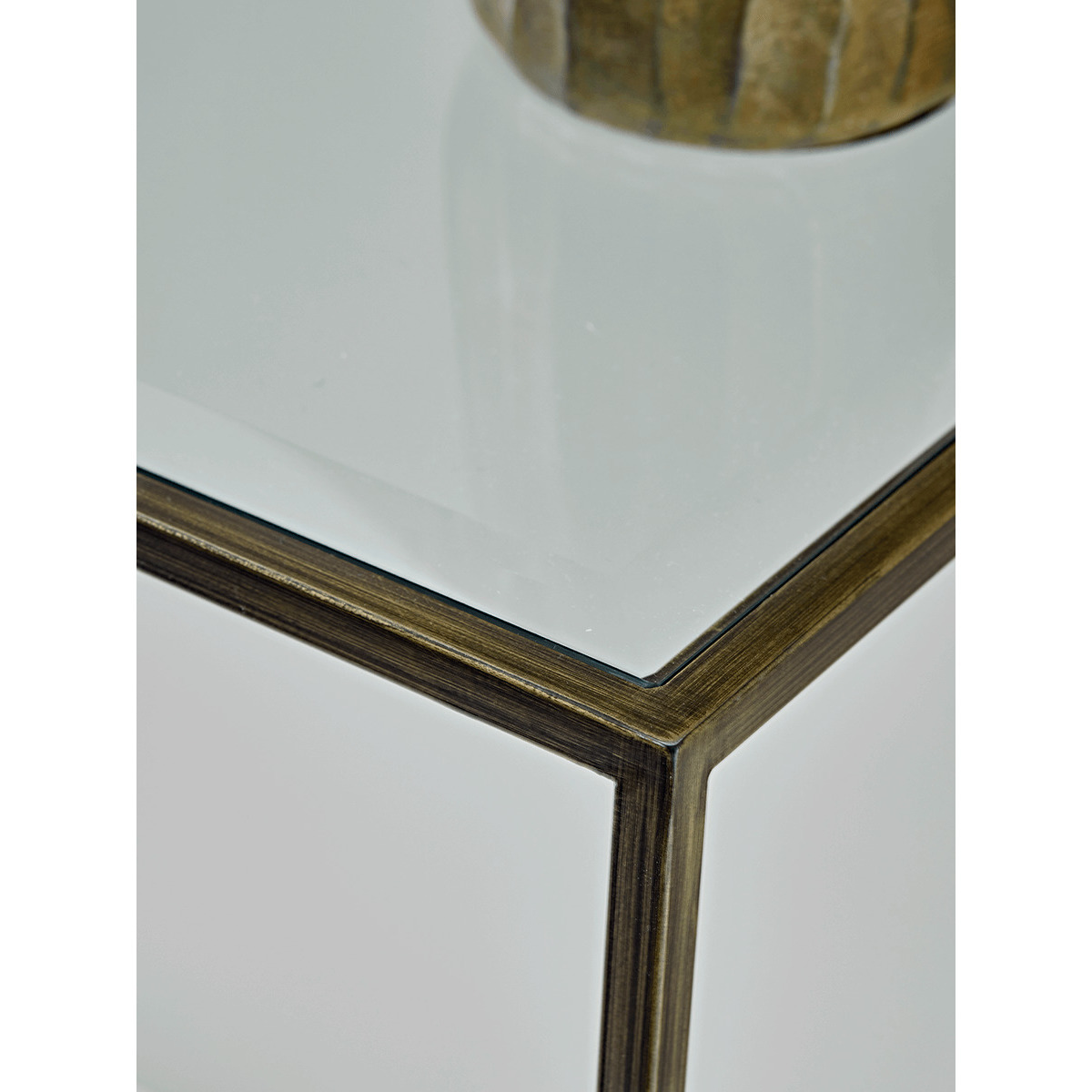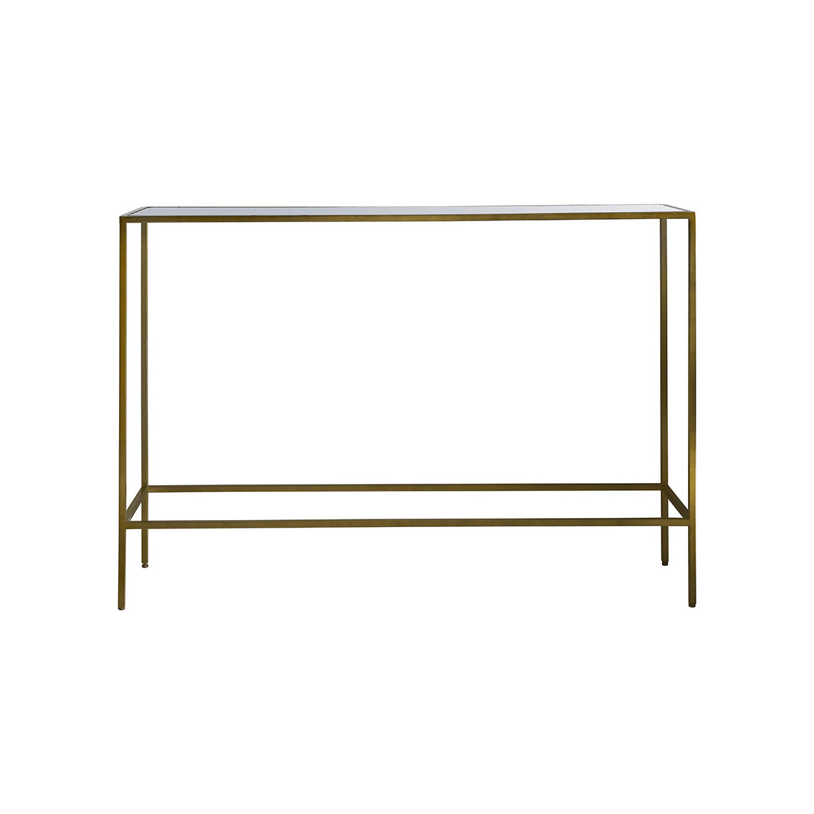 With a slender metal frame and exquisite burnished gold finish, our rectangular console table is perfect for your hallway or living space. The simple design allows for ultimate styling versatility and features a weighty glass top with bevelled edges. Style with our NEW Round Burnished Frame Mirror to recreate our look. Also available as a Side Table.