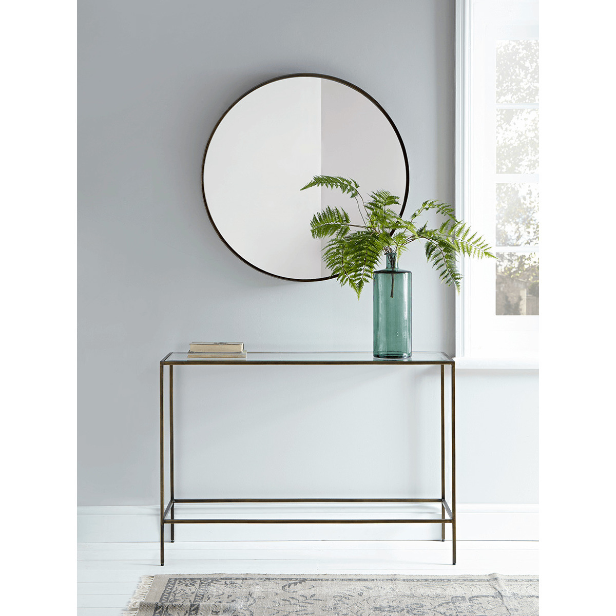 I really like this console - the burnished brass finish adds a touch of subtle luxe without being overpowering. It works particularly well in contemporary or minimalist interiors, where its sleek, clean lines can make a statement without clutter. It’s versatile enough to sit in an entryway, providing a stylish spot for keys and decorative accents, or behind a sofa as a sophisticated layered surface. When styling, keep it simple with a statement mirror above or some curated accessories like vases or books. Its open frame means you should avoid heavy or overly crowded displays, so aim for a few well-chosen pieces to keep the look balanced and elegant.