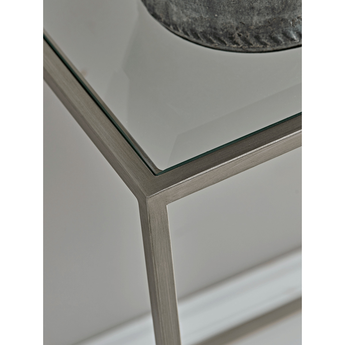 Please accept our apologies, this much loved item is currently sold out. With a slender metal frame and elegant silver finish, our Villette Console Table is perfect for displaying a potted plant or table lamp, as well as providing a sophisticated yet subtle accent to any space. The simple design allows for easy transit across many interior looks, and features a weighty glass top with bevelled edges. Discover more from our. Villette. Range.