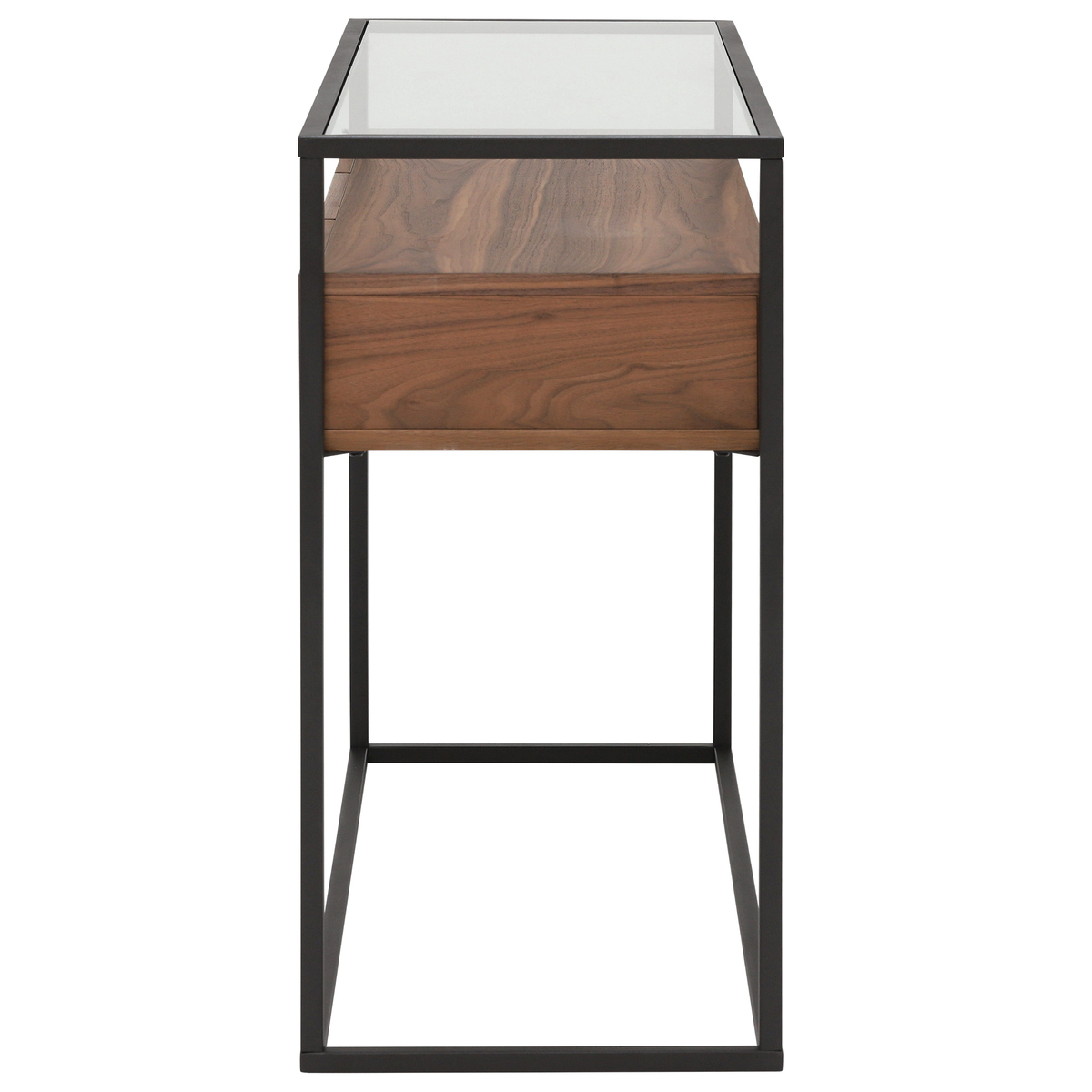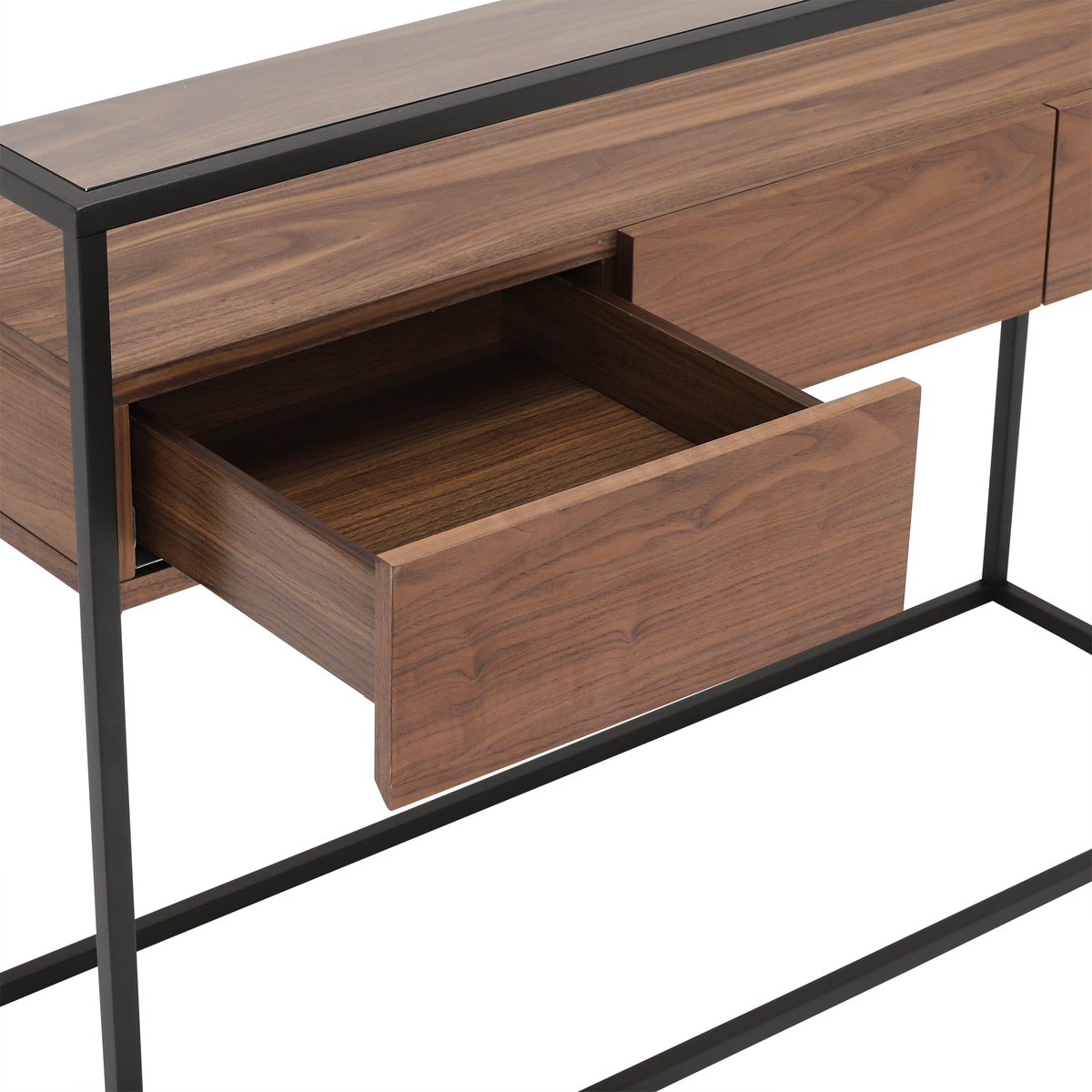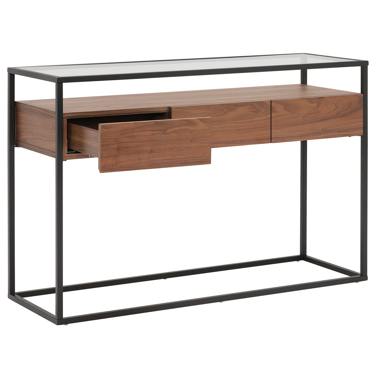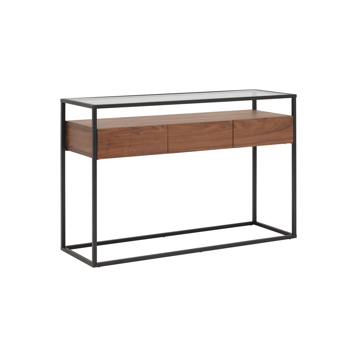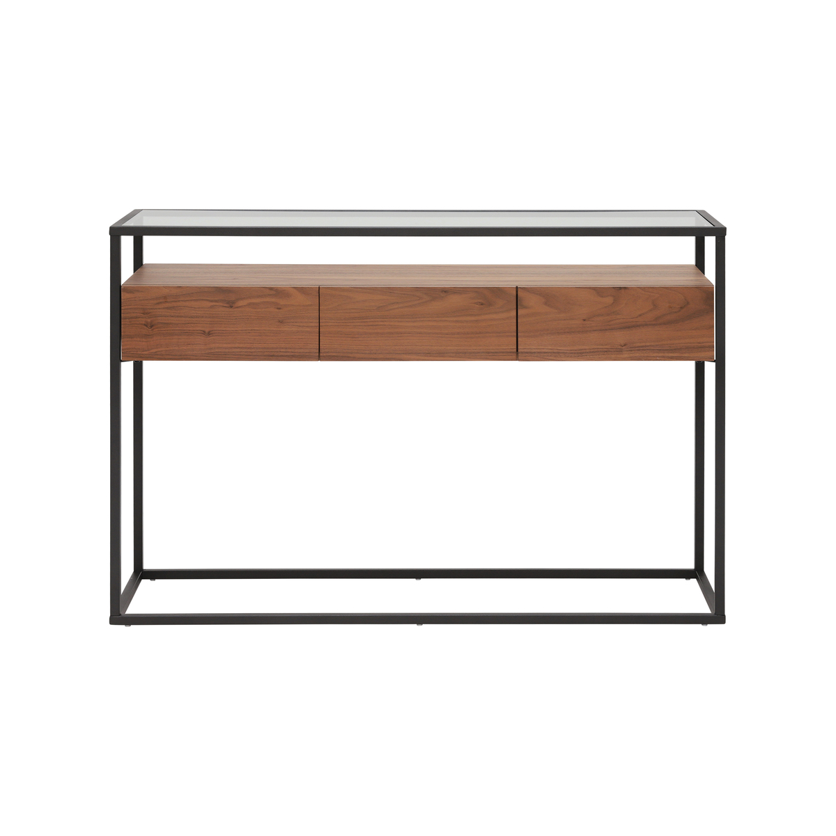 Sleek and contemporary the Vina console table features an industrial metal frame which seamlessly supports three drawers and a glass top. The handle less walnut veneered drawers add a touch of elegance to this piece with the open shelf being the perfect place to stack stylish books or decorative pieces. A clever combination of materials and design this timeless collection works in both traditional and more modern pared back interiors.