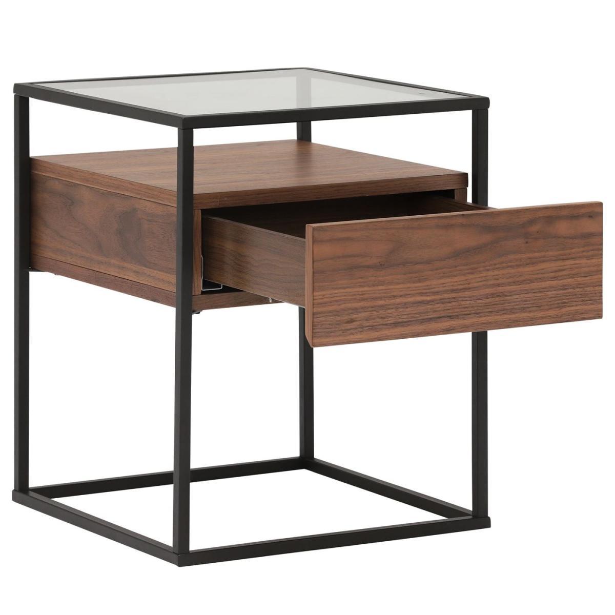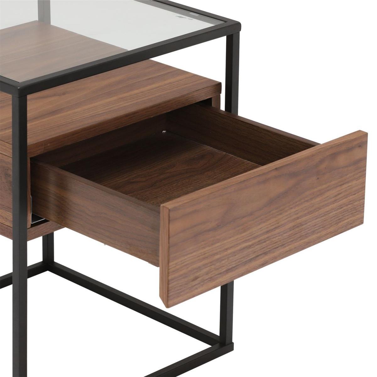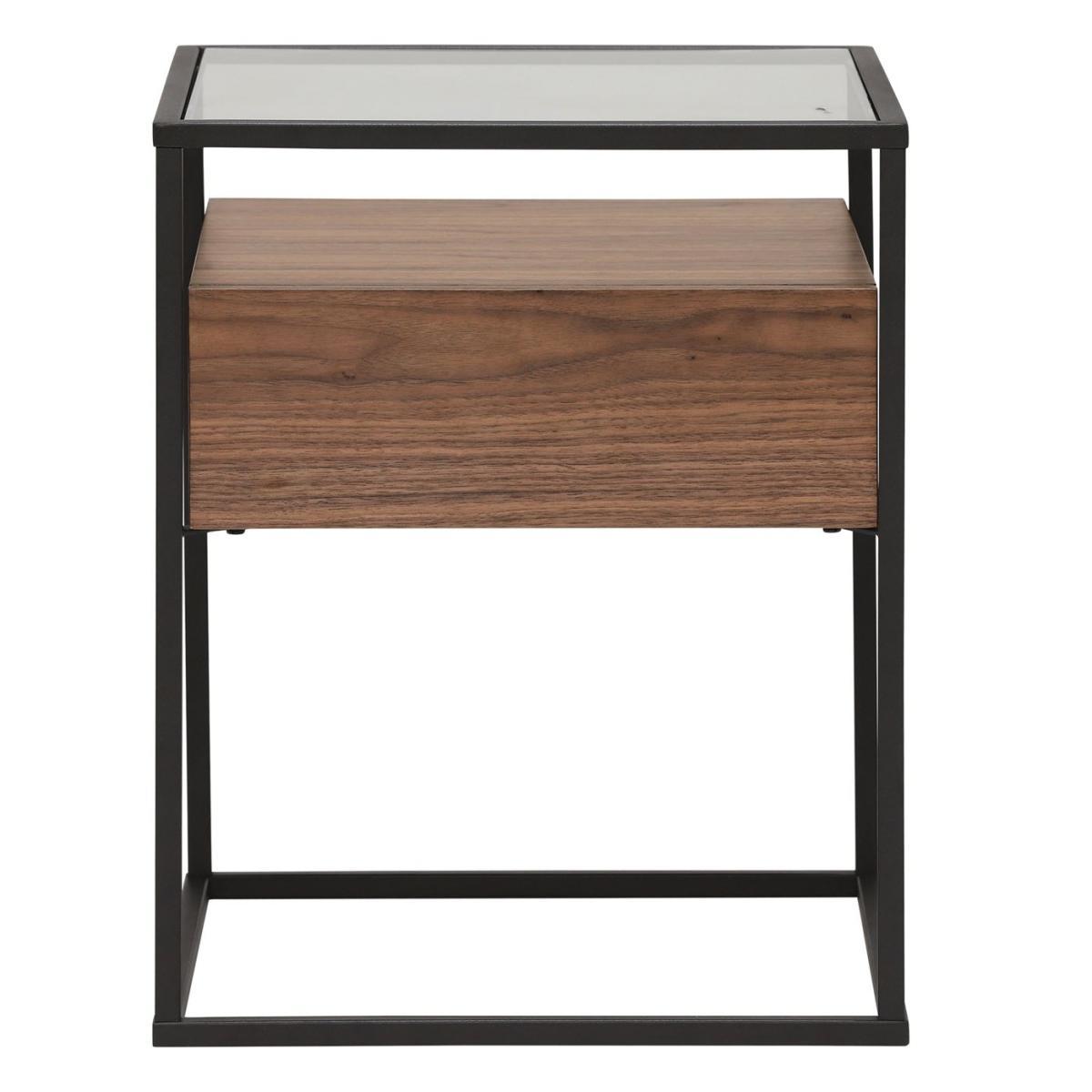 Design. A simple pared back design combining metal, wood and glass creating an elegant yet industrial end table. Perfect in a lounge or living space with a handy drawer for stashing remote controls and an open shelf for displaying decorative items or a stylish stack of books or magazines.