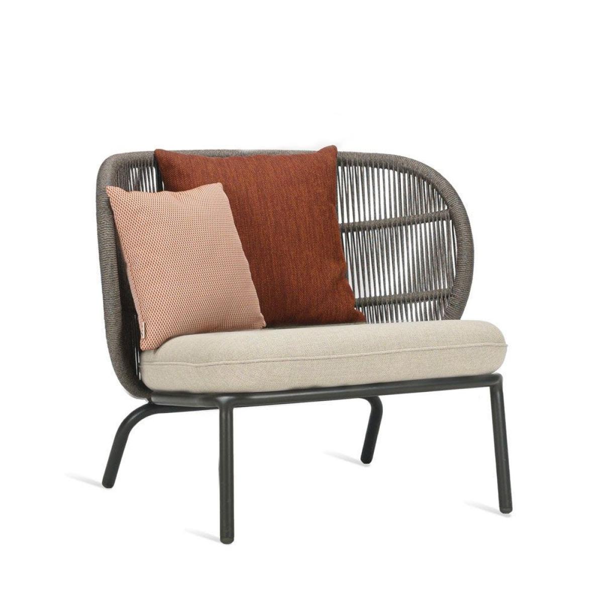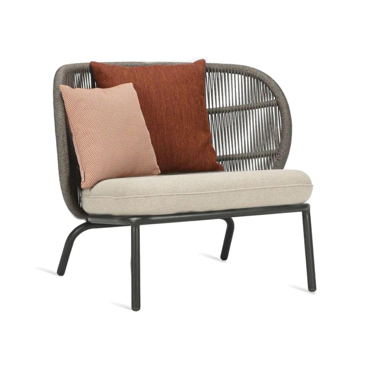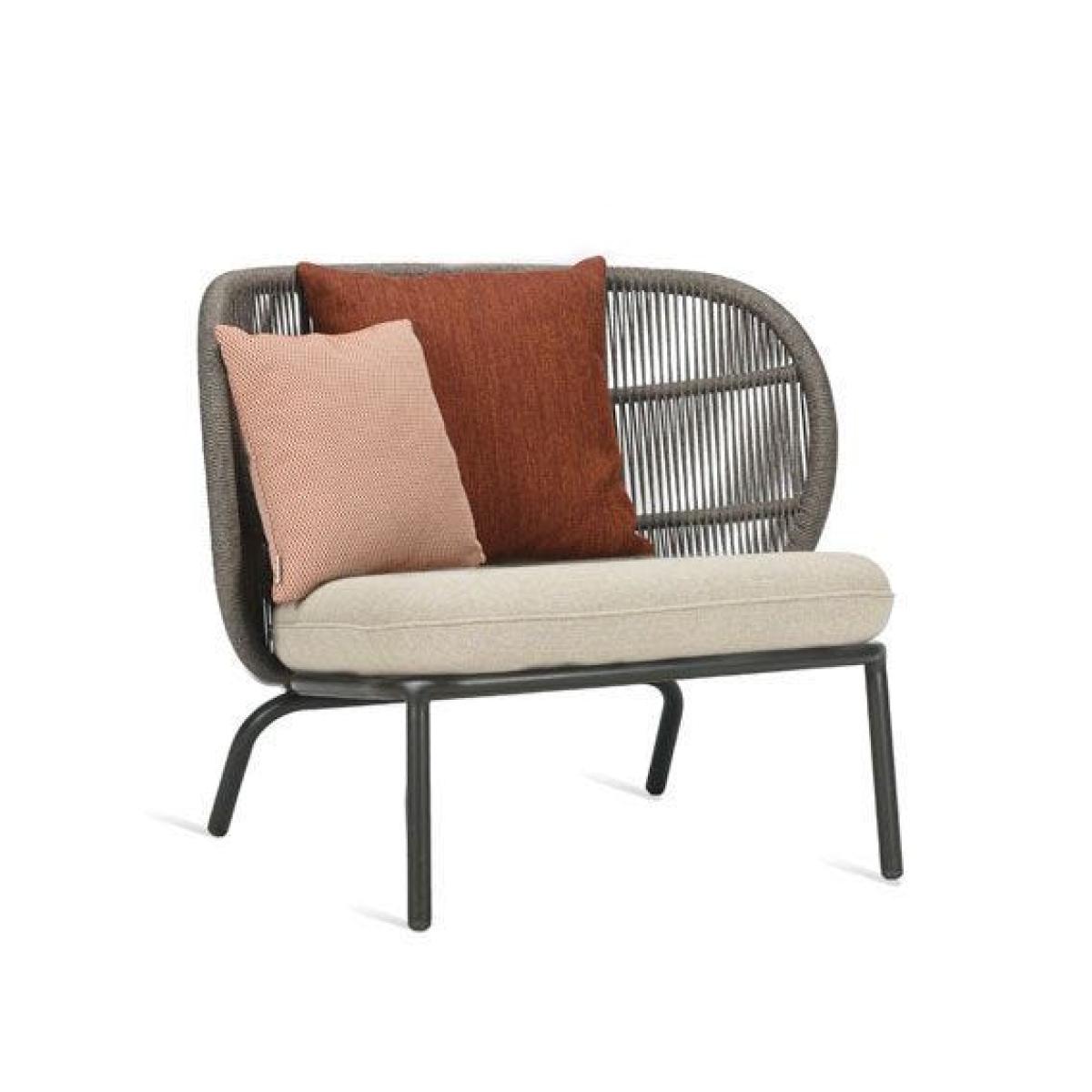 Expertly designed by Studio Segers and crafted by Vincent Sheppard, the almond Kodo Lounge Chair is accompanied by a coordinating seat cushion and two scatter cushions in deep red and coral hues. Acrylic rope is cleverly woven around the aluminium frame to create a comfortable chair that sits elegantly in any outdoor setting. This acrylic rope is specially designed to withstand any weather conditions, so the chair can remain outdoors all year round. Pair with the other chairs and tables from the Kodo collection for a stylish, coordinated garden seating area.