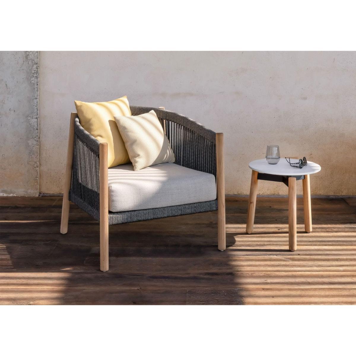 While the overall feel is laid-back and relaxed, the prominently featured solid teak legs and high woven rope backs give the collection a rich and engaging personality. The anthracite rope and warm teak match perfectly with the Lento coffee and side tables. The tables feature a light-toned ceramic table top, which creates a spacious feeling while adding structure as well. Bertrand Lejoly’s Lento collection consists of a lounge chair, lounge sofa, coffee & side table and modular lounge set.