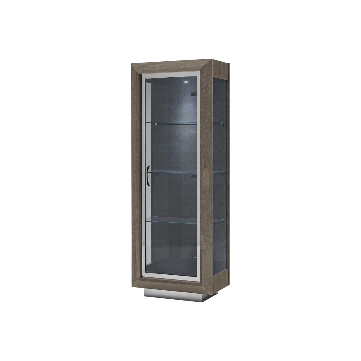 The Vinci 1 Door Cabinet is an elegant storage solution that will offer much more in the way of design. A glass fronted door offers a glimpse into your chosen display items and suggests a sense of luxury. Elongated lines run from floor to top and are finished with a taupe grey gloss. LED lighting delicately illuminates glass interior shelving, and a sleek metal handle provides a touch of glamour. The Vinci 1 Door Cabinet will look perfect sat in a modern or contemporary space and can be an elevated look when paired with the Vinci 2 Door Sideboard.
