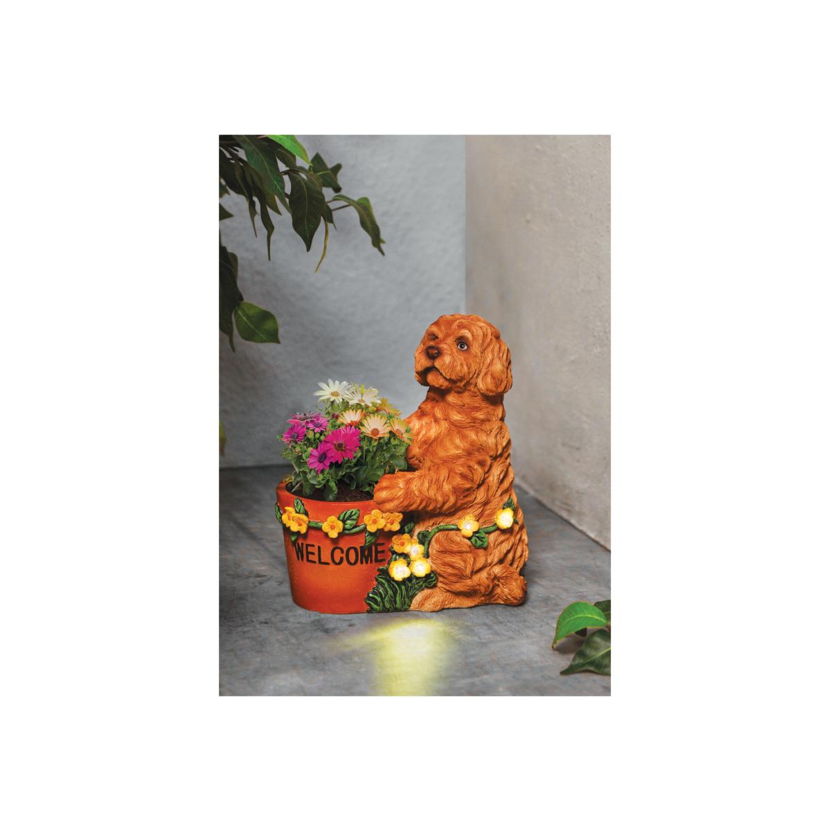 This adorable Vinnie Solar Dog Planter will be the perfect welcoming decoration for your garden or outdoor space. Handpainted with incredible detail, this will make a great addition to your garden decor. Cute and highly detailed, animal lovers will adore this outdoor decor. It has an auto sensor that turns on when dark and conveniently charges during the day.