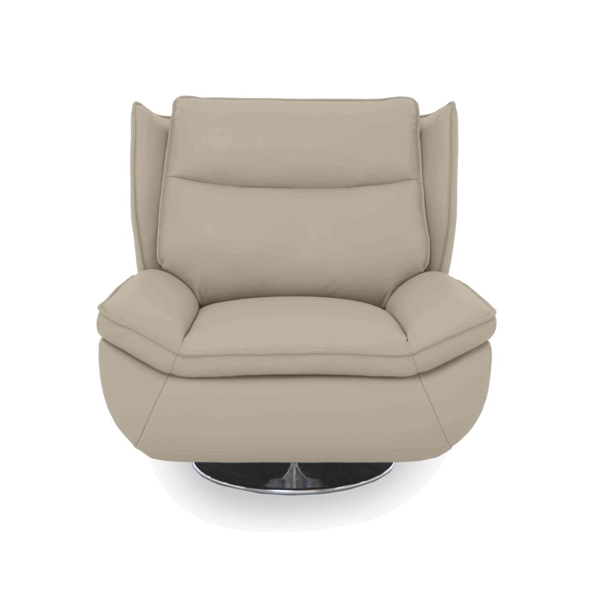 Exuding class and style, this fabulous 1970s-inspired swivel chair is fully upholstered in soft 100% leather. It’s the ultimate in cool living room style. Why you'll love it Sink into this cool 1970s-style leather swivel armchair. Fantastically comfortable cushioning all over – seat, back and arms. Sprung seat for real support. Sturdily constructed with a wood frame. 100% leather upholstery in a wide choice of colours. This leather swivel armchair is exclusively available at Furniture Village. What you need to know Medium comfort level. Seat suspension: pocket spring. Back suspension: webbing. Seat cushioning: foam and Dacron. Seat cushion is fixed. Back cushioning: fibre. Back cushion is fixed. Arm cushioning: foam and Dacron. Leather has unique marks and characteristics with variation in colour and texture. Leather softens with use. Smoothing the tops of leather cushions prevents signs of visual comfort. Please read our upholstery care guide for more advice.