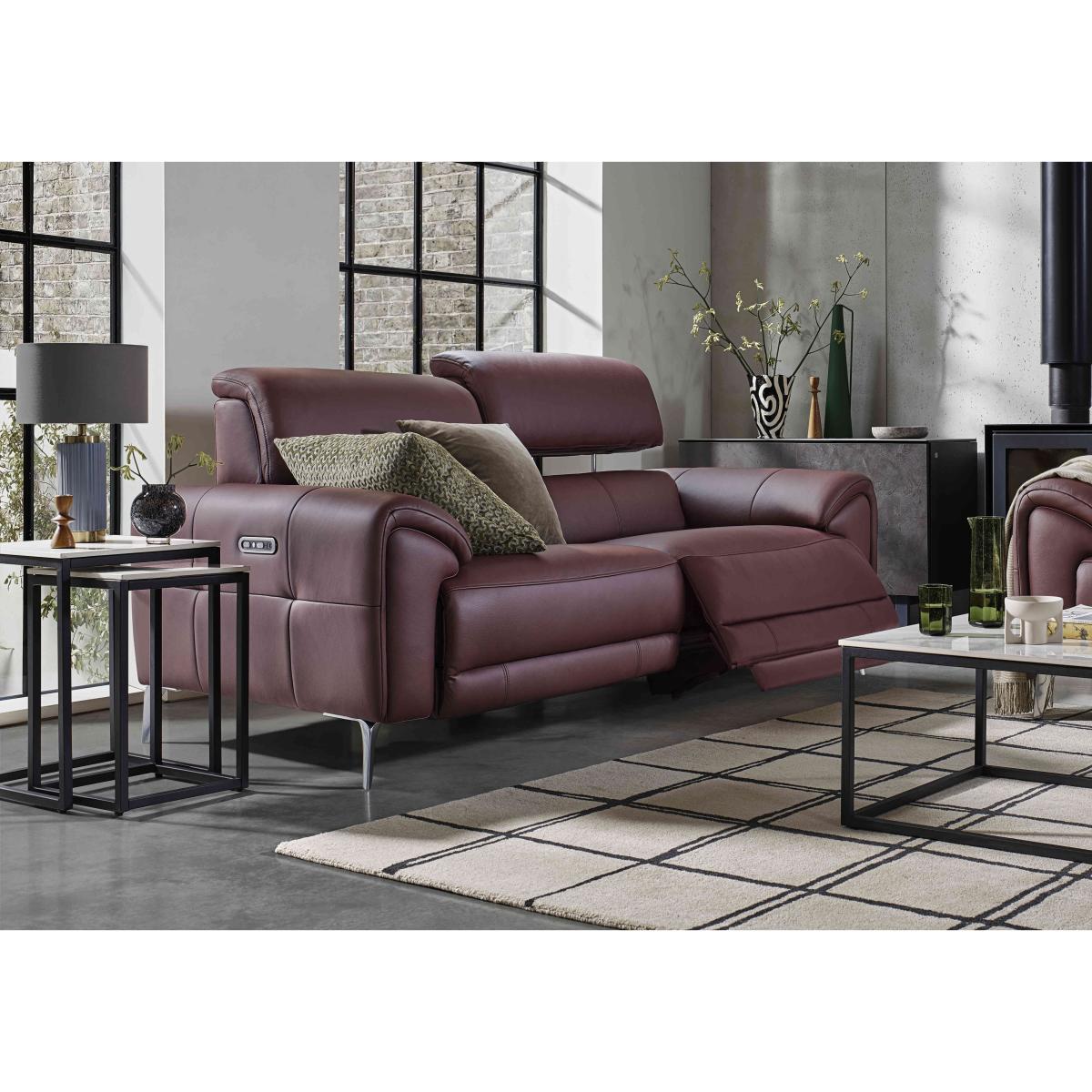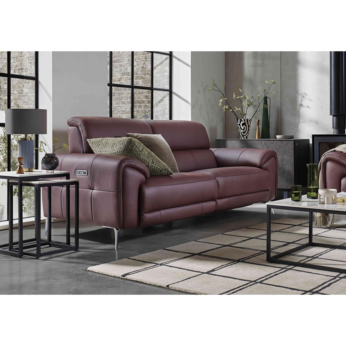 Our very stylish Vino range of sofas, armchairs and footstools goes the distance when it comes to comfort. As well as power recliners and perfect-position power headrests – both of which are independently adjustable – the collection’s sofas and chairs are available with heated seats, so it’s easy to get cosy and comfy on a chilly morning or cool evening even if you have the central heating turned down. Offered in both 100% leather and velvet-soft fabric upholstery, the collection delivers the coolest of modern style with slim metal legs, stylish yet subtly curved arms, and modern piping and buttoning. The Vino range is exclusively available at Furniture Village. This particularly large and luxurious leather sofa has pocket spring seats, cool modern style details and is even available with optional power recliners and headrests. A Furniture Village exclusive. Why you’ll love it Cool modern style and superb comfort in perfect harmony. Available with optional power features – power recliners and perfect-position power headrests. Power reclining back and elevating footrest are independently adjustable. Power sofa option also has built-in USB device charging. Fabulously comfy seat cushions have pocket spring interiors. On-trend details include metal legs, piped edges and understated buttoning. In a wide choice of stunning colours for the soft 100% leather upholstery. Exclusive to Furniture Village. This leather 3-seater sofa is part of our Vino range. What you need to know Medium comfort level. Seat suspension: sinuous spring. Seat cushioning: pocket spring. Cushions are fixed. Back suspension: webbing. Back cushioning: fibre. Cushions are fixed. Arm cushioning: foam and Dacron. Feet are removable. The non-recliner version of this sofa does not have power headrests and USB charging. Please allow time for new recliners to ease. Minor gaps are necessary to ensure ease of recliner motion and may be exaggerated depending on floor type. Leather has unique marks and characteristics with variation in colour and texture. Leather softens with use. Smoothing the tops of leather cushions prevents signs of visual comfort. Please read our upholstery care guide for more advice.