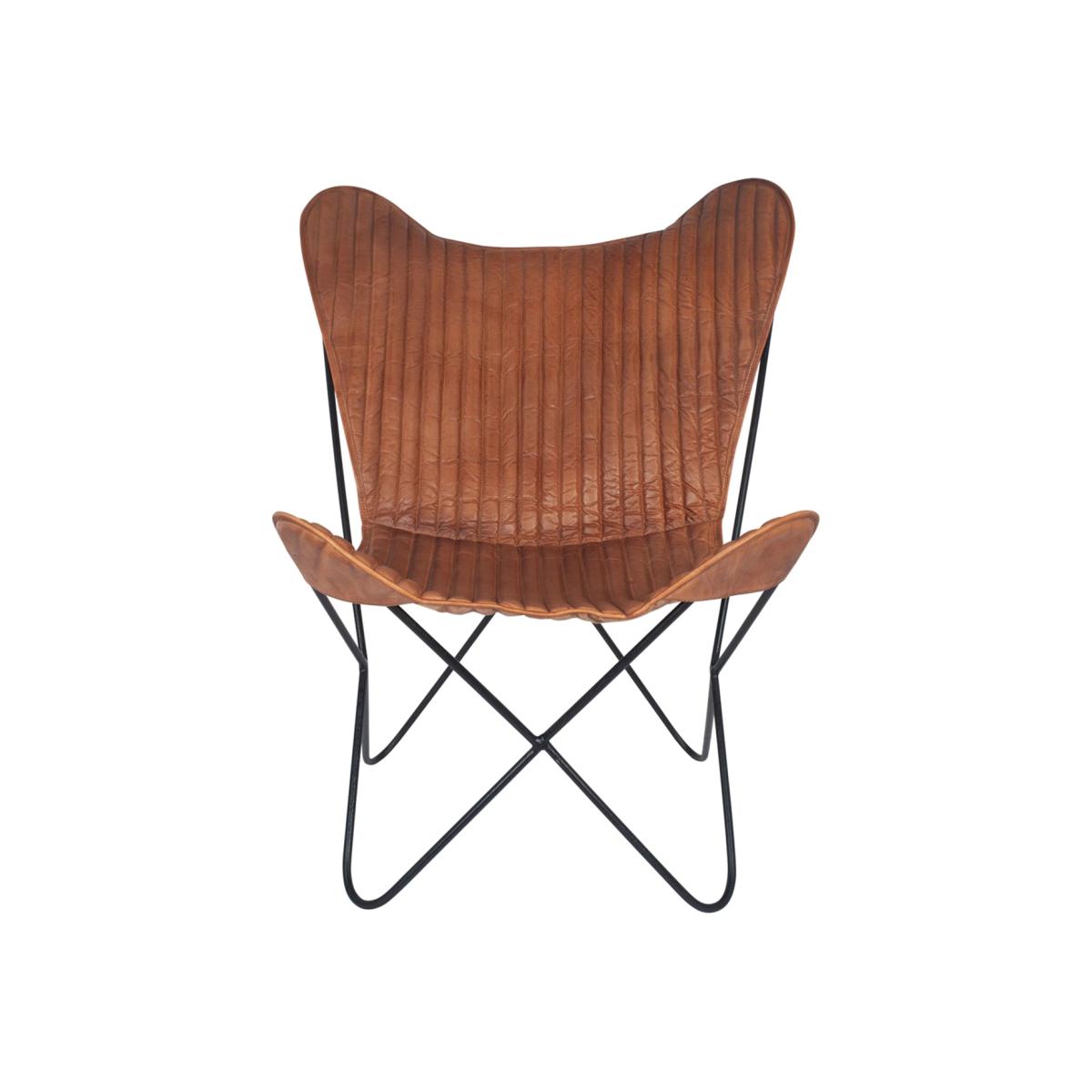 Quintessential in shape, this butterfly chair has a quiltedvintage brownleather seat cover suspended from the a matt black iron metal frame. Also available in steel grey and hide leather.