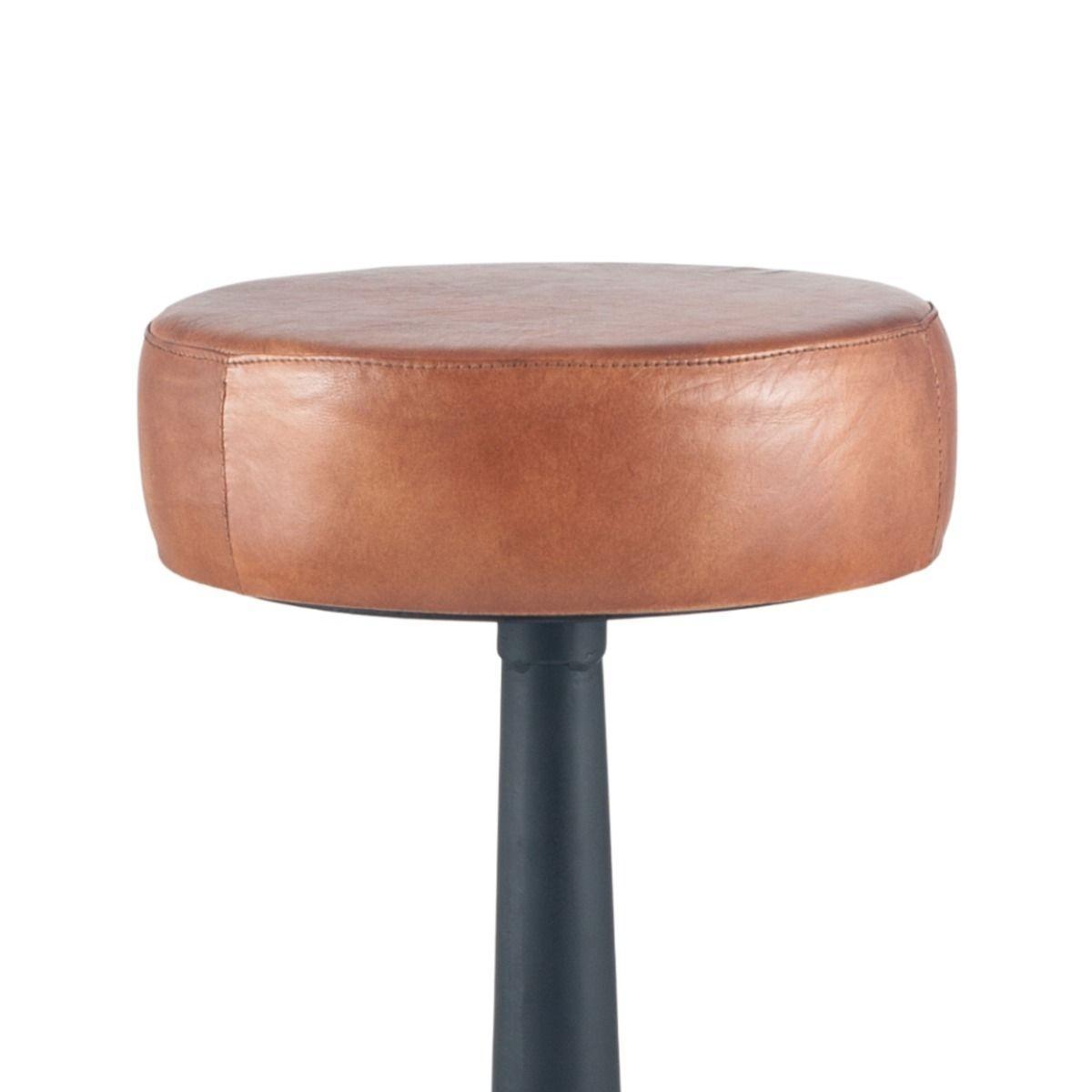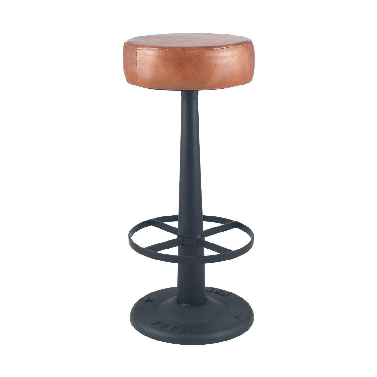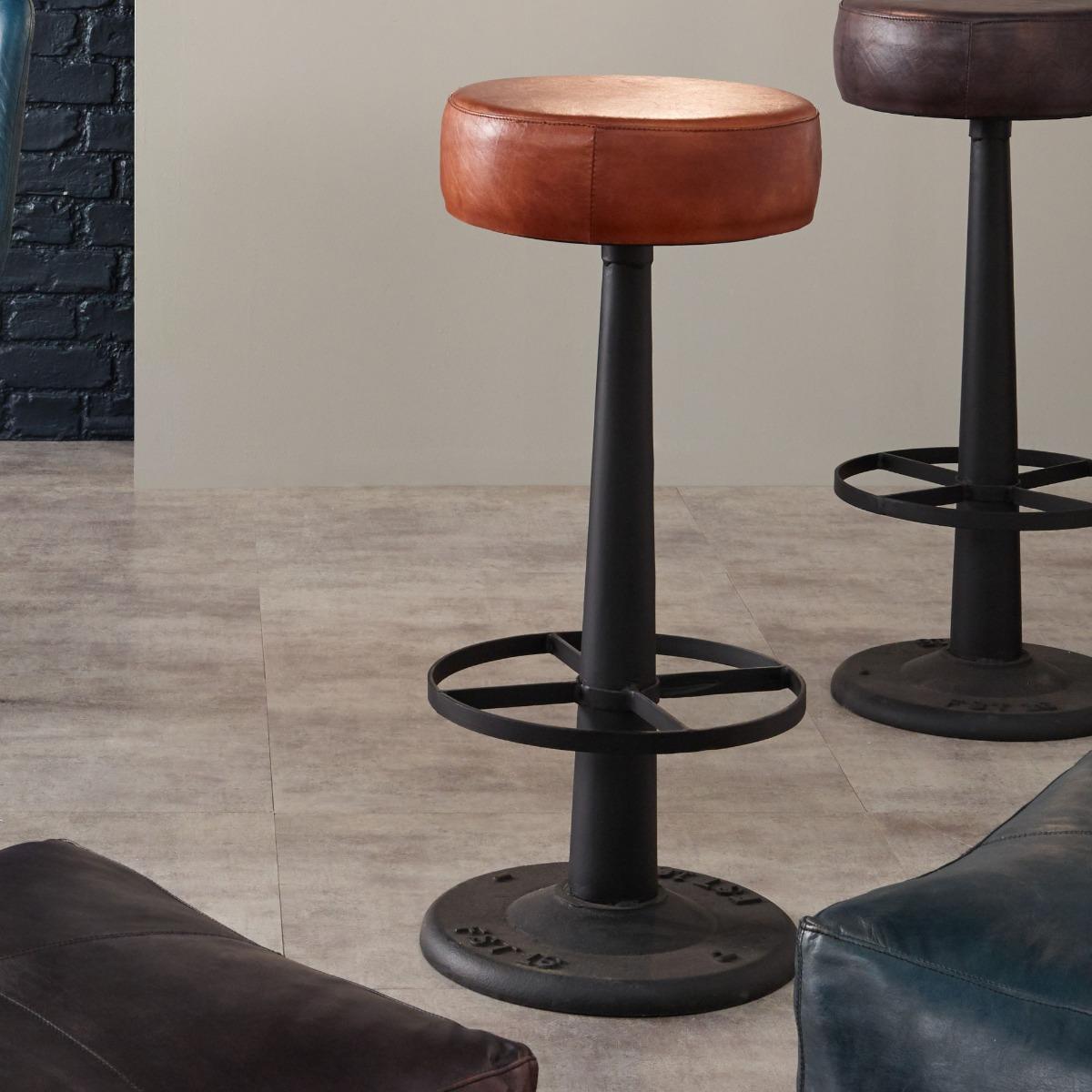 Incredibly stylish and contemporary brown padded leather bar stool with an industrial iron base. A stylish addition to any residential or commercial premises, the Vintage Brown Bar Stool is an edgy and modern piece. Boasting an industrial, dark iron pillar base with quirky raised lettering with useful wheel style footstool, this rustic stool is paired with a stylish brown padded leather seat. Also available in vintage grey leather.