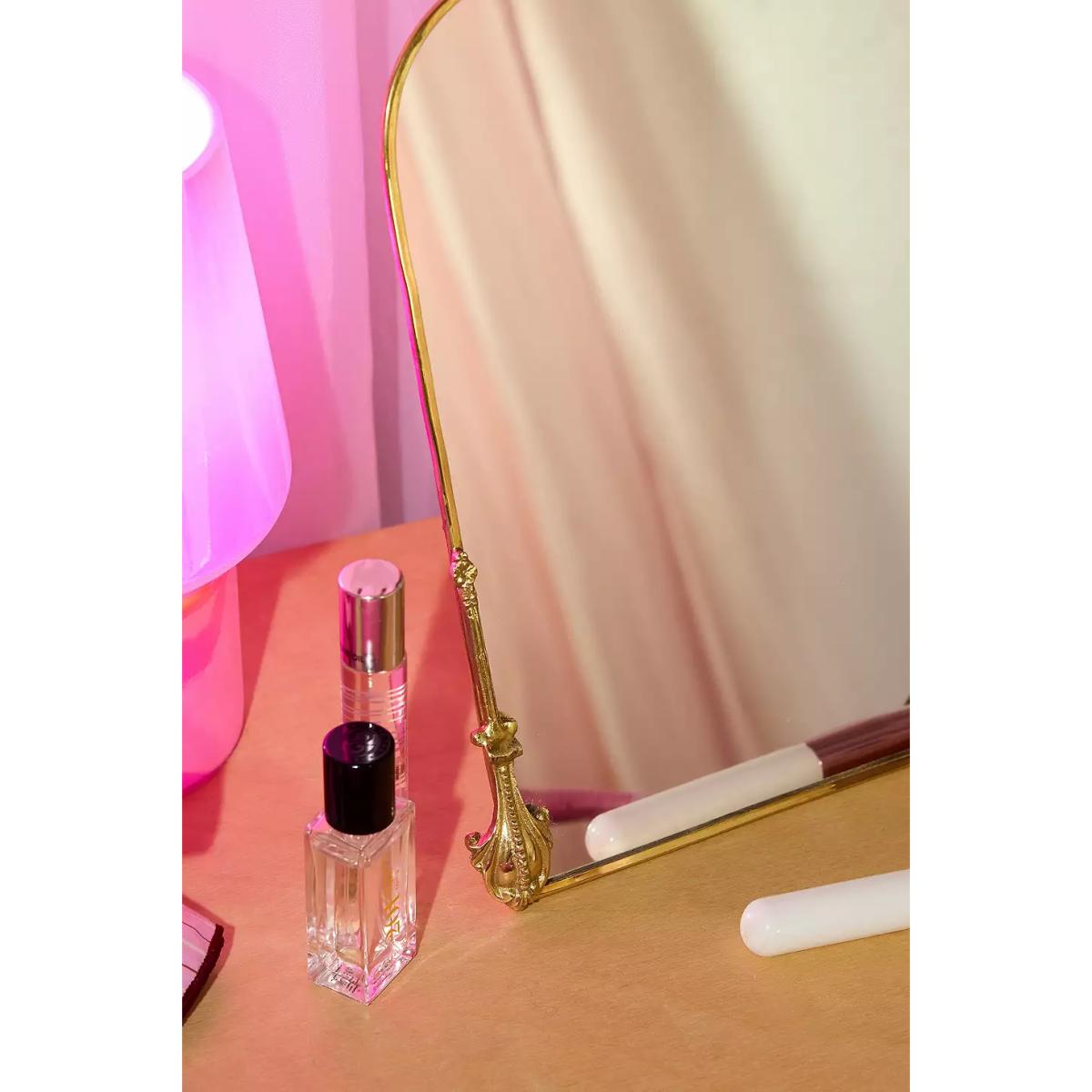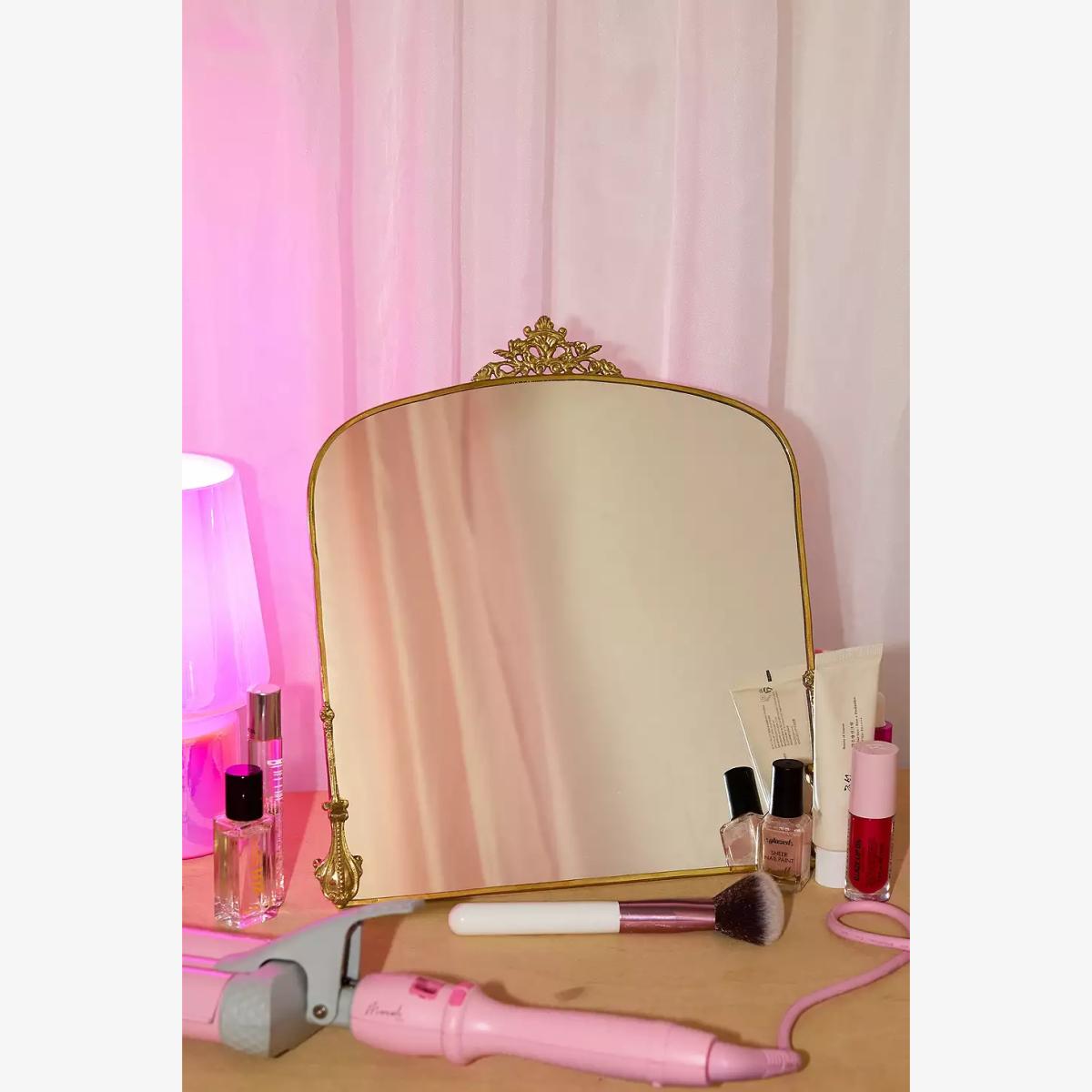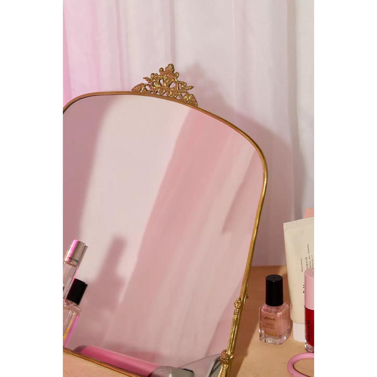 Pretty desk mirror with a vintage-inspired design. An arched shape complete with an ornate gold metal frame and stand. **Content + Care** \- 60% Brass, 40% Glass \- Wipe clean **Size** \- 27 x 27.4cm