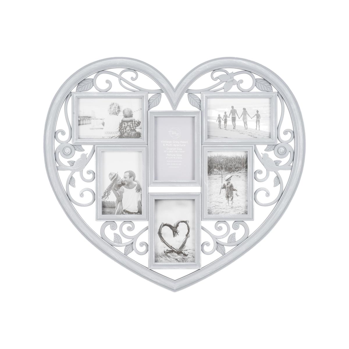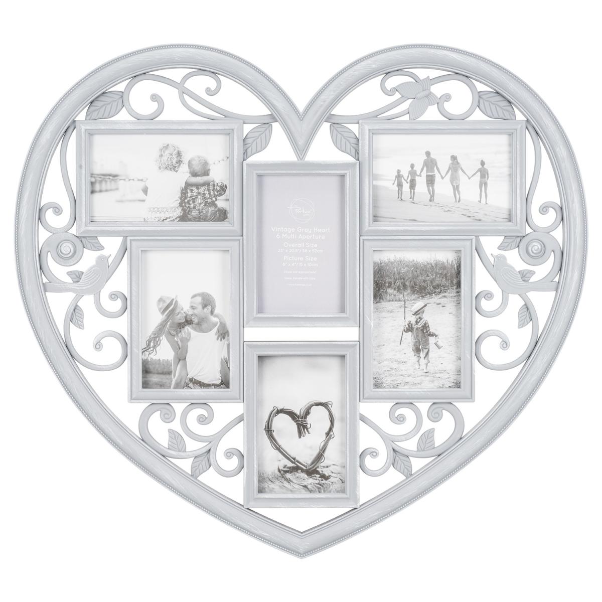 Turn your treasured memories into a breathtaking wall display with this Vintage Grey Heart 6 Multi Aperture Frame, featuring beautiful fretwork of curling vines, birds, and butterflies. Finished in distressed grey with classic bead detailing, this shabby chic frame can hold up to six of your photographs within its heart-shaped design.