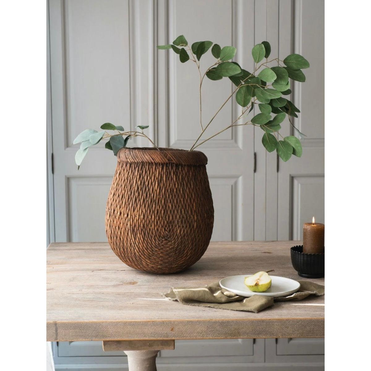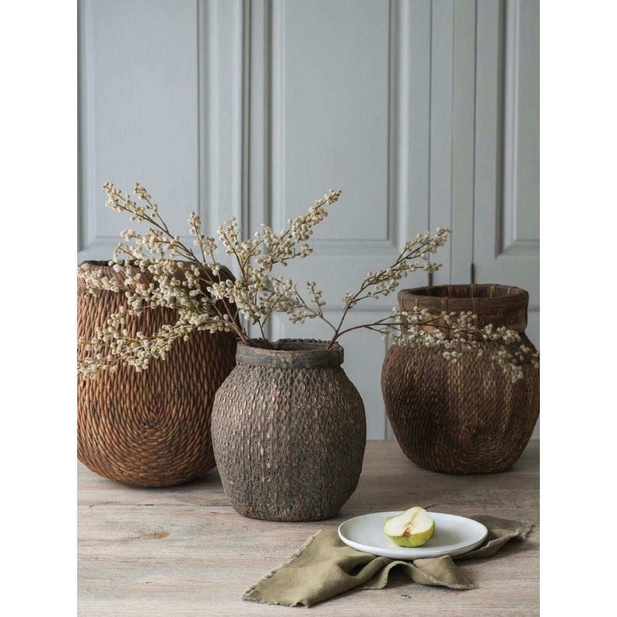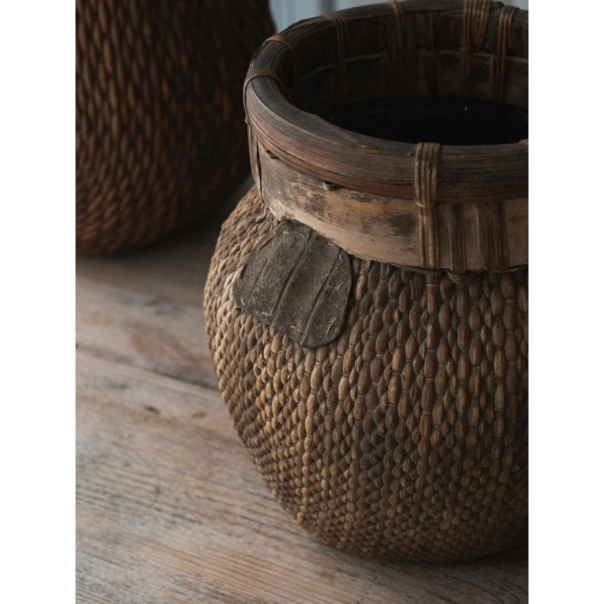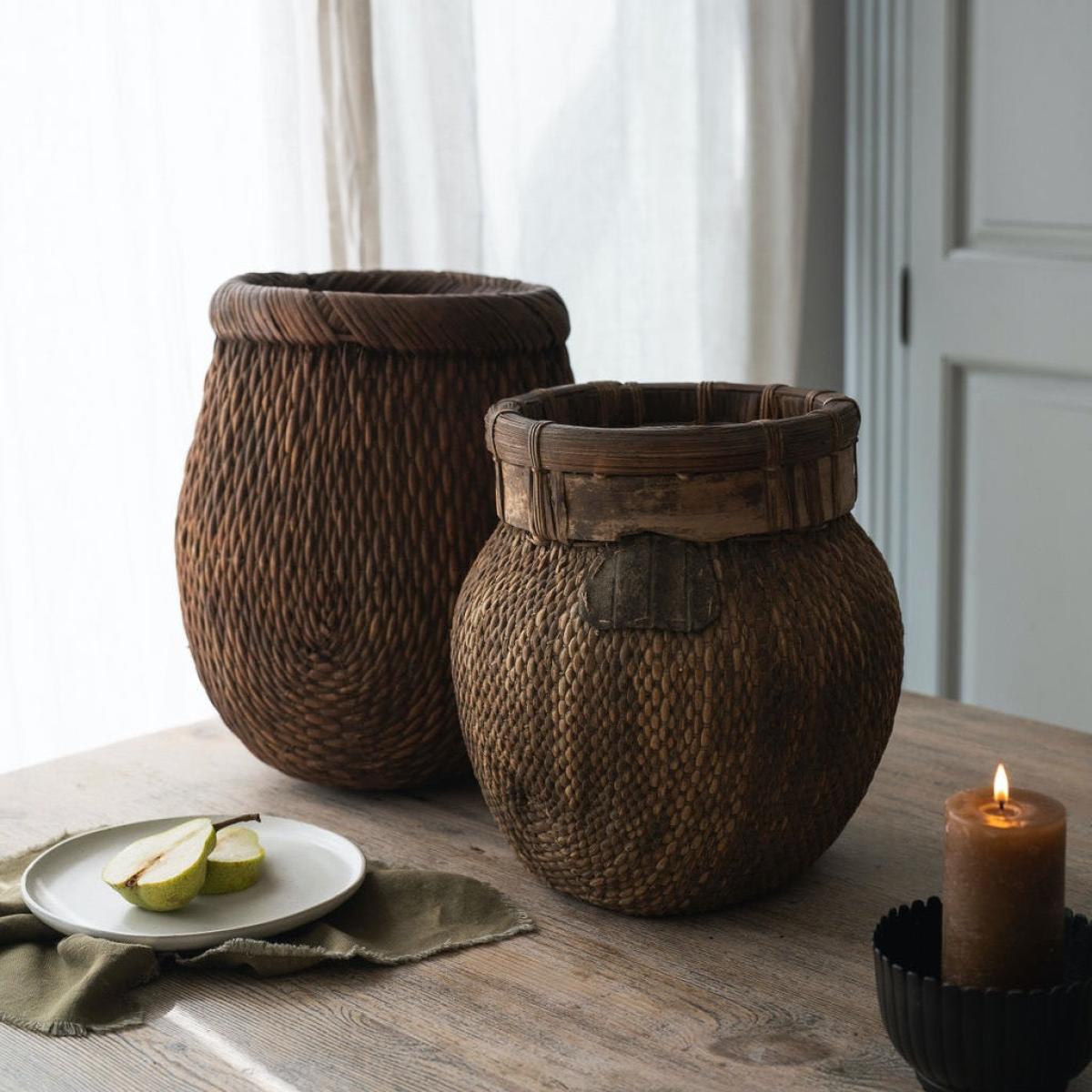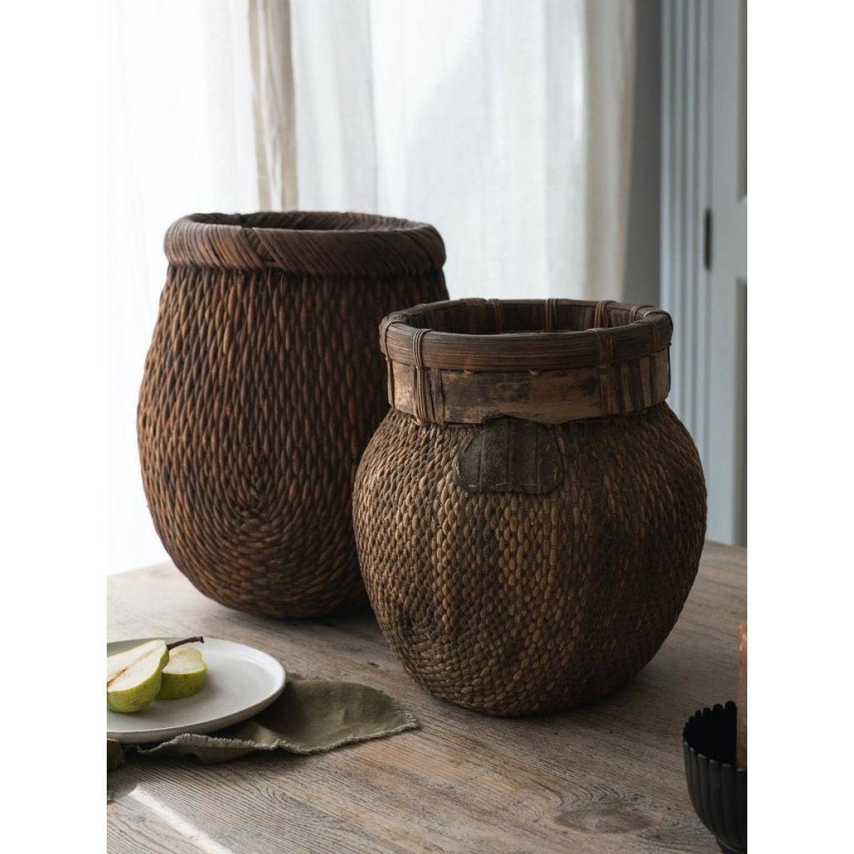 A vintage Chinese oil basket which would be used in the countryside to store oil. Made traditionally from wicker and clay each piece tells its own story and each piece will be unique. Sizes will also vary. We love to mix old with new in a home and are a firm believer in Wabi Sabi, an interiors concept where pieces are deemed more beautiful when had made with slight imperfections and which get better with age.