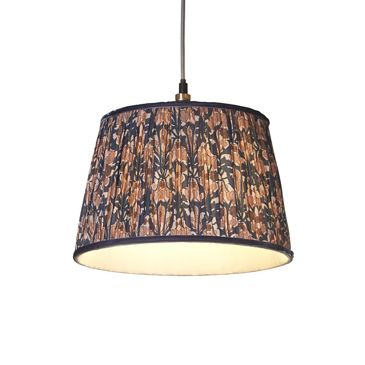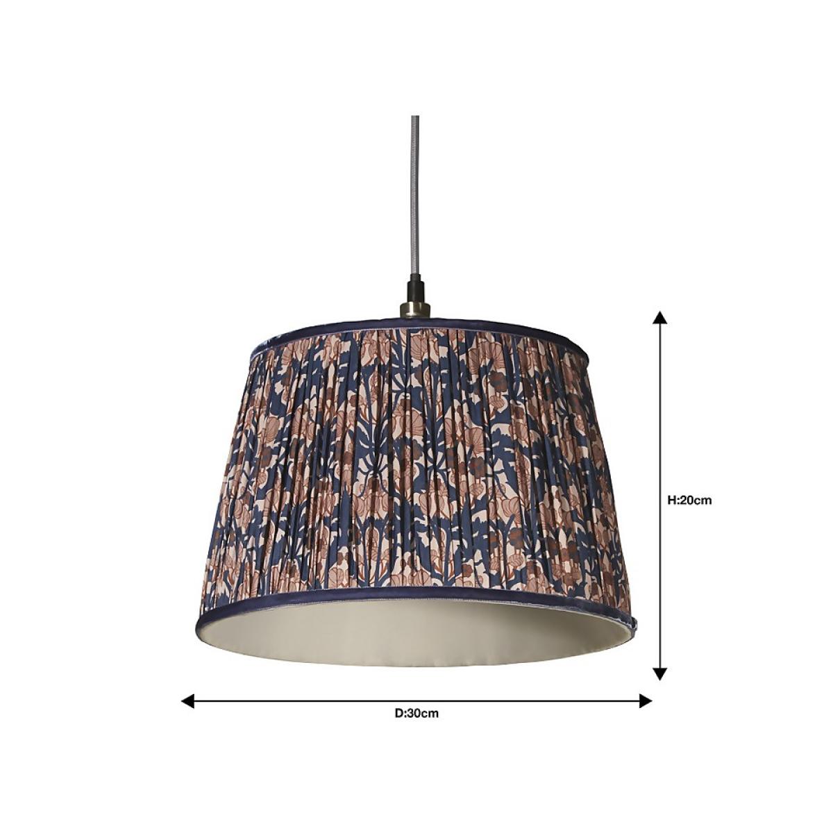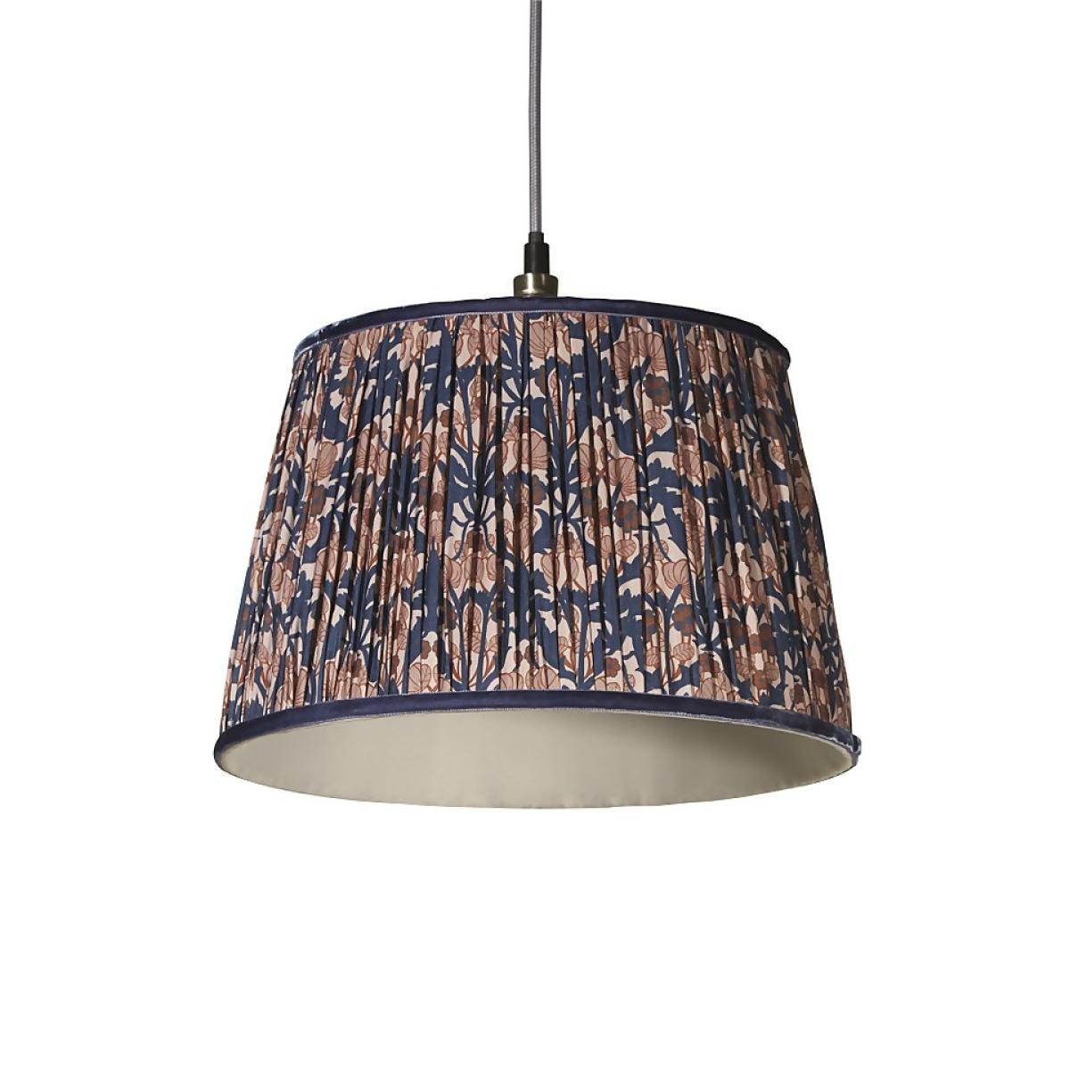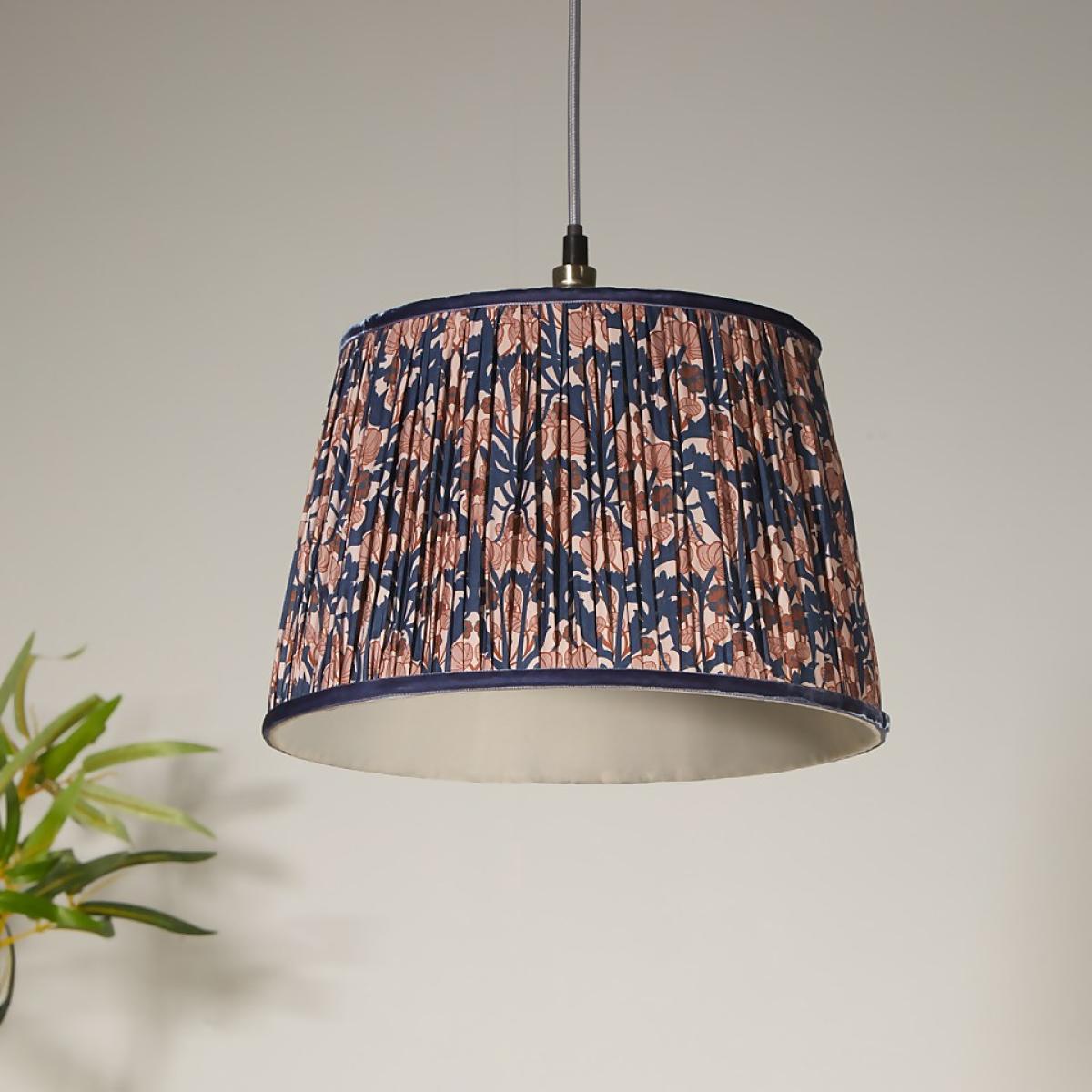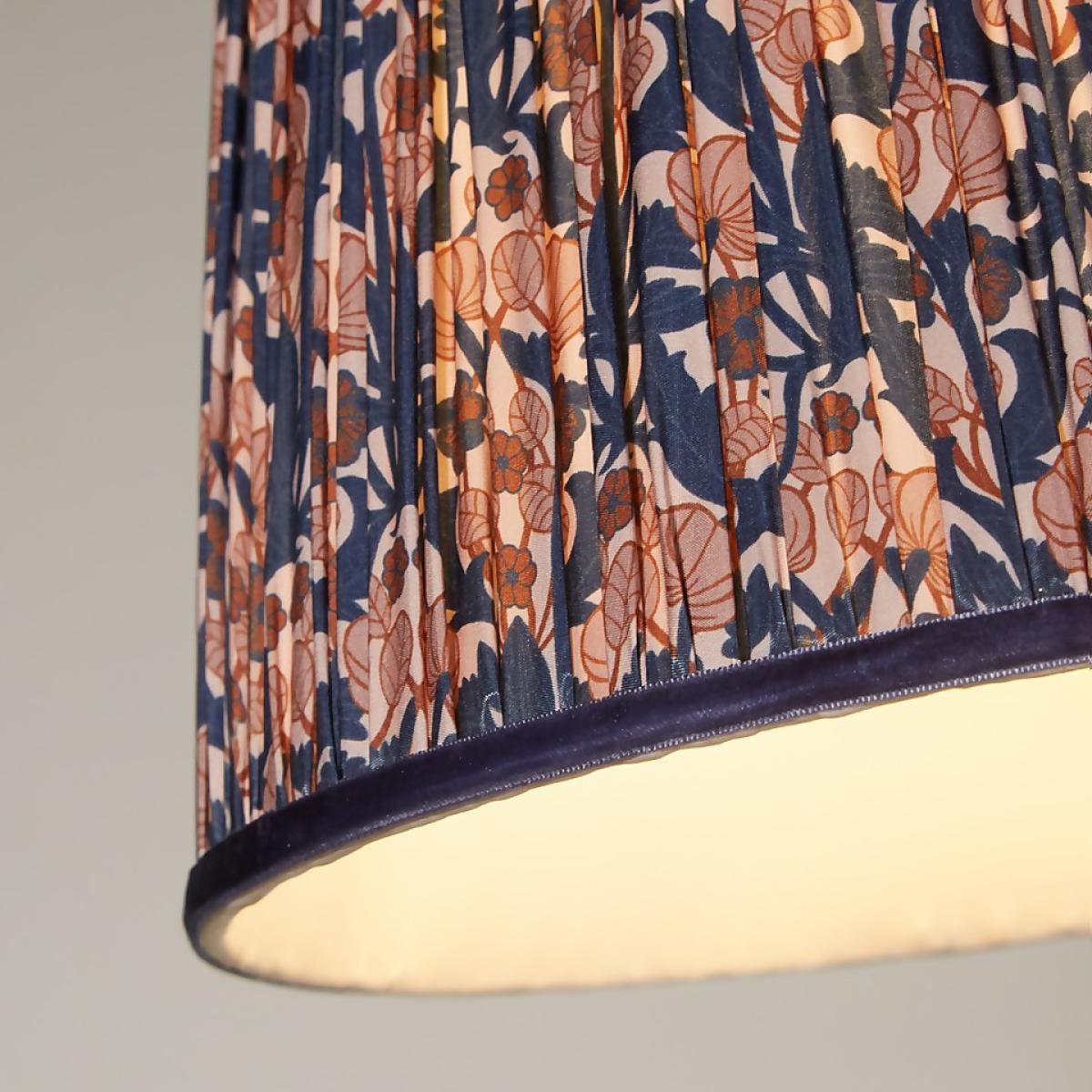Add colour and texture to any room with this stunning easy fit tapered shade. The navy base vintage inspired print is folded into pleats and finished with contrast velvet, creating a simple way to add a pop of colour to any living space, bedroom or hallway, updating existing light fittings easily, and giving a soft glow to any room.