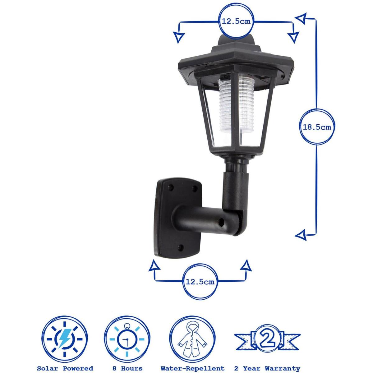 This wall lantern is manufactured from PP PS material with a 2V40mA solar panel. It comes with a white LED 11000-13000mcd requires 1 x AA 1.2V 600m. Ah NiM H battery.