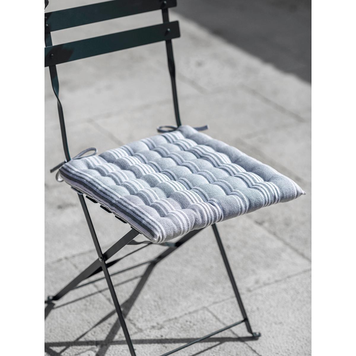 Back in stock soon!. Made from cotton with a cosy fibre filling and pin-tucked design, our comfortable seat pad is perfect for softening your outdoor furniture. Each cushion has two ties to attach to any chair, and a grey vintage stripe pattern.
