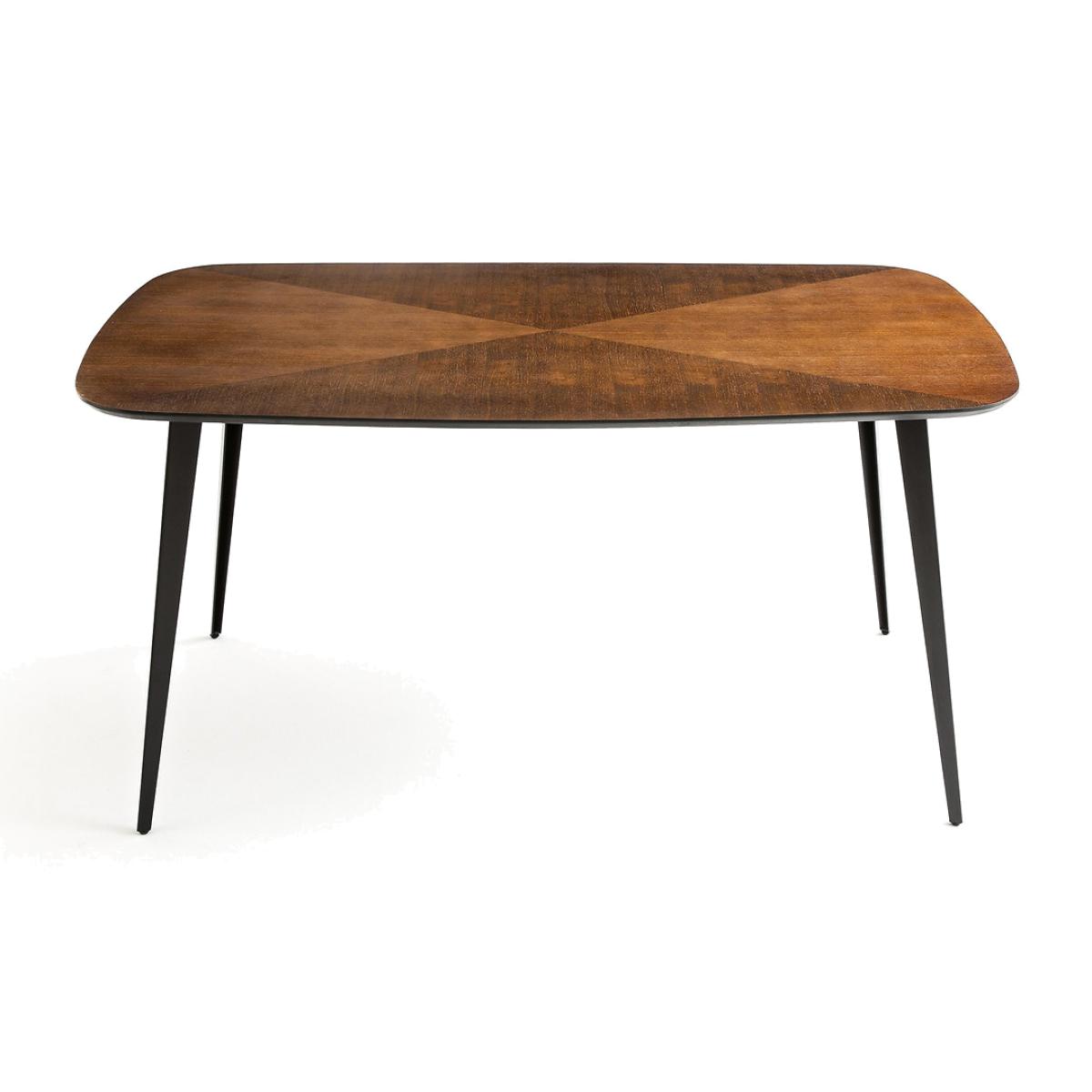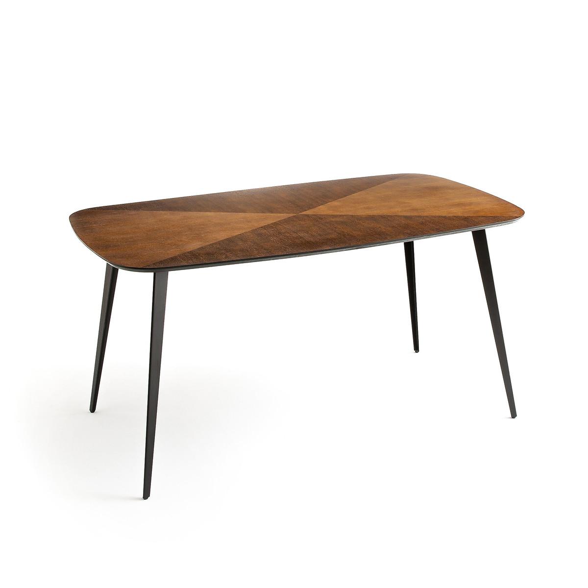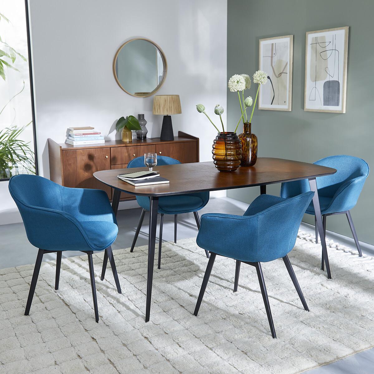 The Watford inlaid vintage dining table: style 50’ avec ses pieds fuselés et la touche sophistiquée du plateau replaqué en marqueterie de noyer. Product Details • Seats 6. • MDF top with rounded corners in walnut marquetry with nitrocellulose varnish finish • Bevelled edges. • Tapered steel matt black lacquered legs, epoxy finish. • Adjustable plastic feet. • Assembly: 1. H environ, 2 personnes (minimum)Care instructions • To protect your table, consider trivets, coasters and placemats. Dimensions • Length: 150cm • Height: 75cm • Depth: 90cmDelivery:. This product is sold ready to assemble..Note! Please check that all access points are large enough to accommodate your delivery (doors, stairs, lifts).Dimensions and weight of parcel:2 parcels • L 86.7 x H 13.3 x D 46.7cm • 7.6 kg • L 161.5 x H 11.5 x D 101.5cm • 24kg