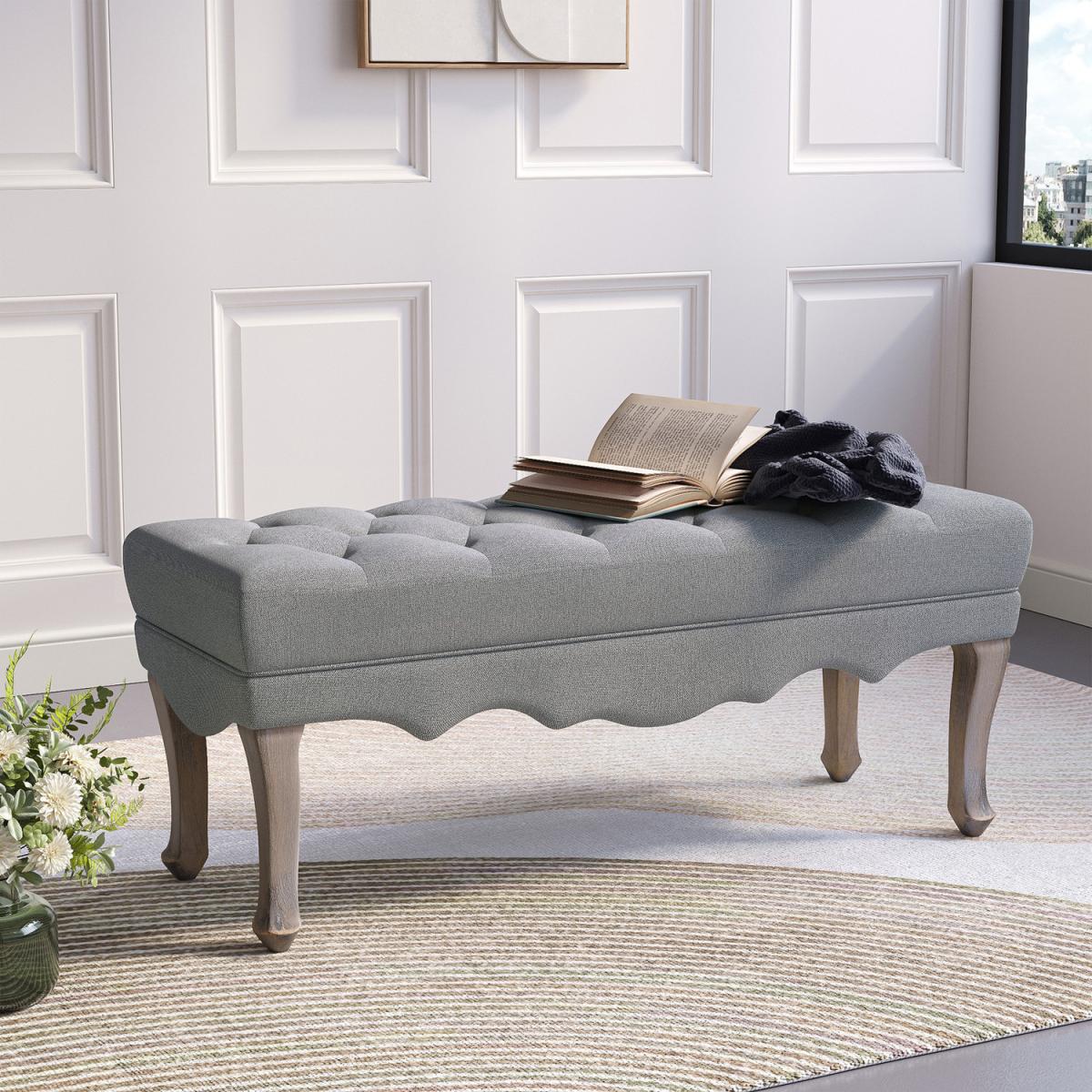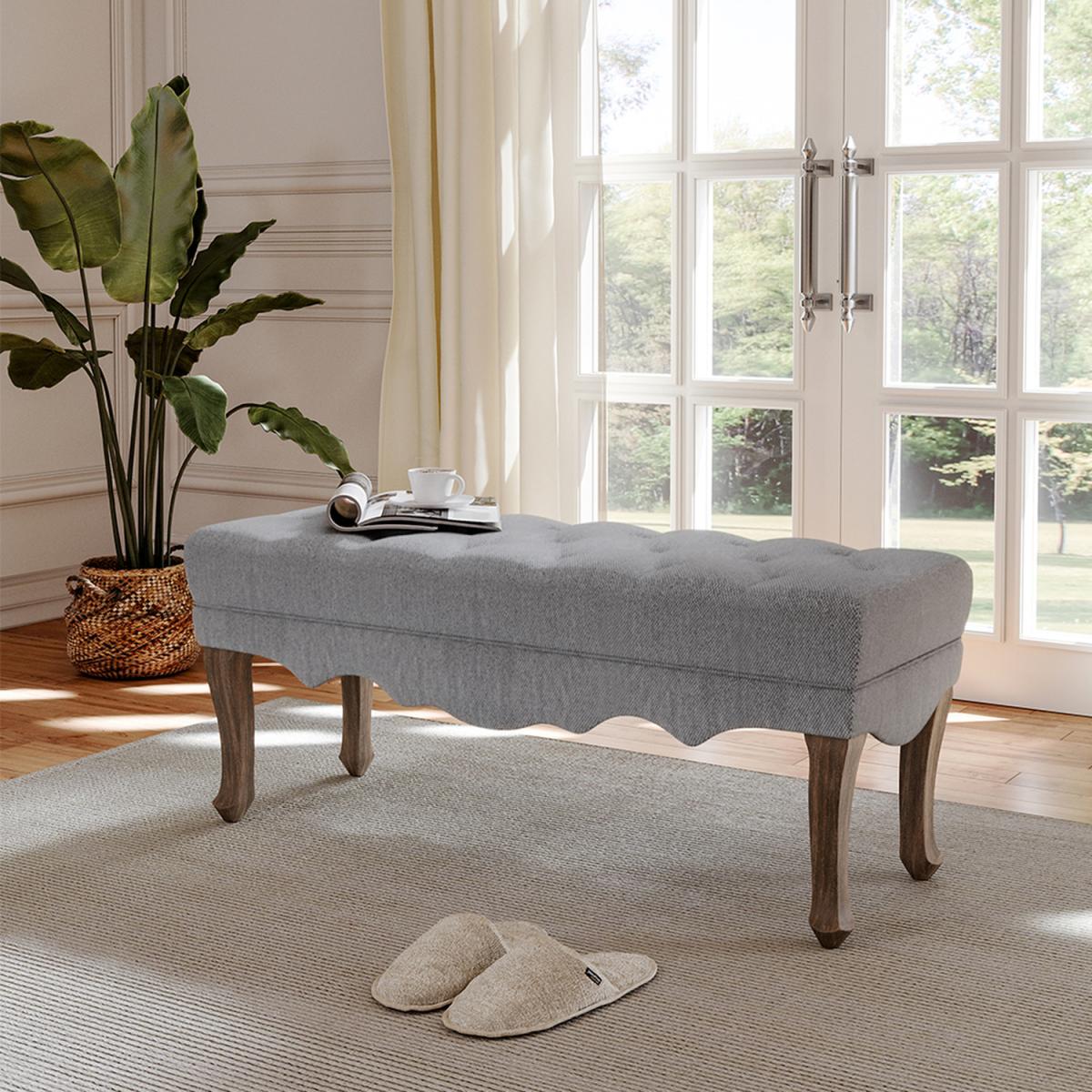 Elevate your home aesthetics with the timeless allure of the Linen Ottoman Bench by Livingandhome. The bench blends classic design with modern comfort, presenting a stunning piece that complements various interior styles. The defining feature of it lies in its beautifully distressed cabriole legs, reminiscent of vintage charm. These meticulously crafted legs not only provide exceptional stability but also infuse an air of sophistication that instantly transforms any room into a refined haven. The soft and breathable linen upholstery enhances the overall appeal while offering a cozy seating experience. Whether placed in your entryway to welcome guests or in your living room for relaxation, this bench proves its versatility. Designed with a meticulous focus on craftsmanship, the bench seamlessly marries style with practicality. The natural fabric seating not only offers comfort but also resonates with the warmth of classic interiors. Ideal for creating an inviting atmosphere in your home, this linen-upholstered bench becomes a focal point of conversation.