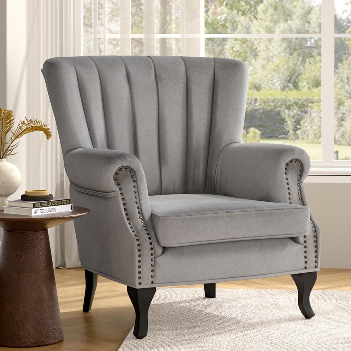 Add a touch of chic elegance to your space with this sleek and stylish velvet armchair. Its channel-tufted back and studded sides offer understated luxury, while the plush velvet upholstery and dense foam cushioning ensure ultimate comfort. Perfect for enhancing your living area, this armchair promises both style and coziness.