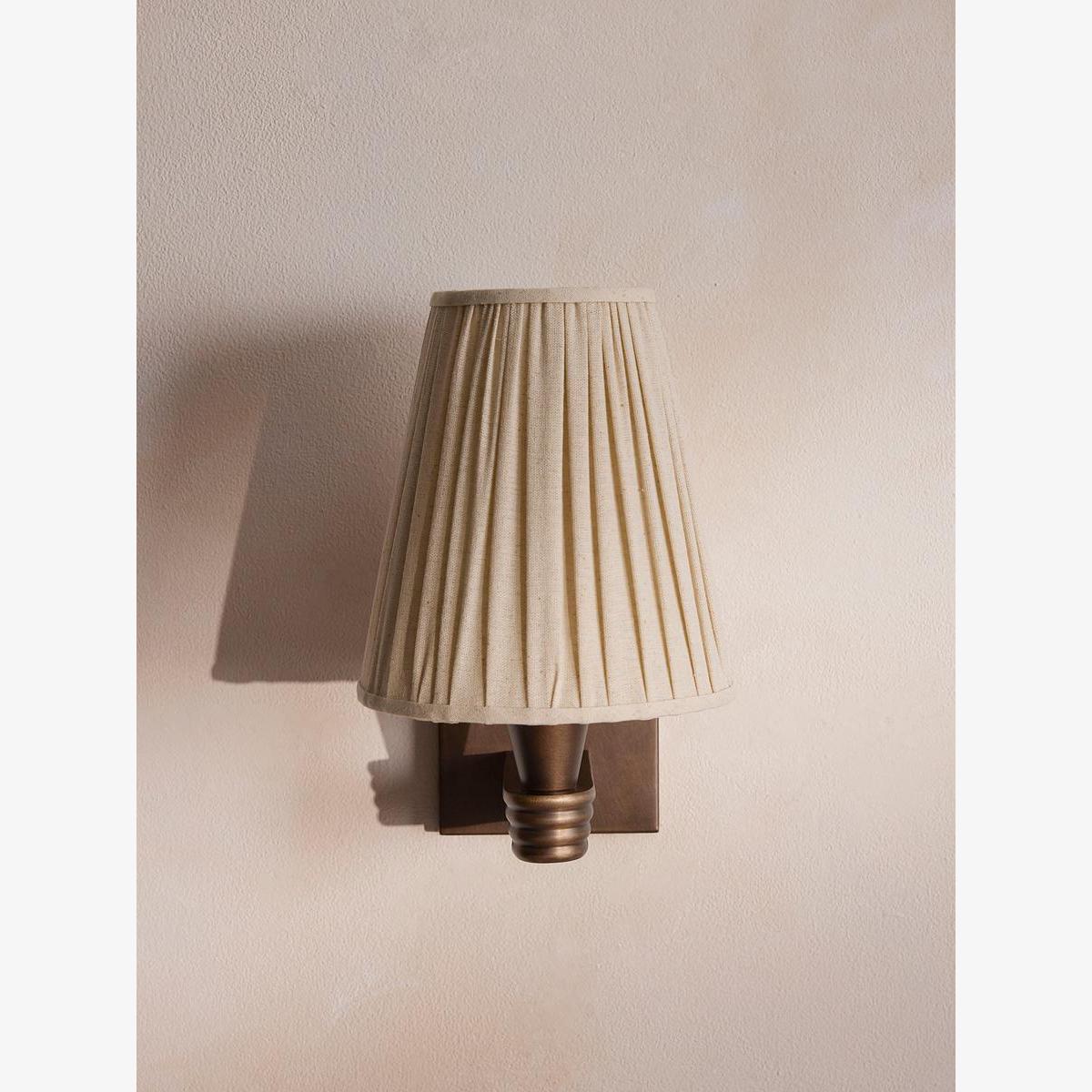 This wall light is secured by a fluted bronze arm that was created using a bespoke mould. The Viola wall light's tapered shade is made from patterned linen that is pleated by hand. It takes style cues from the neutral-toned lighting seen throughout Soho House Rome.
