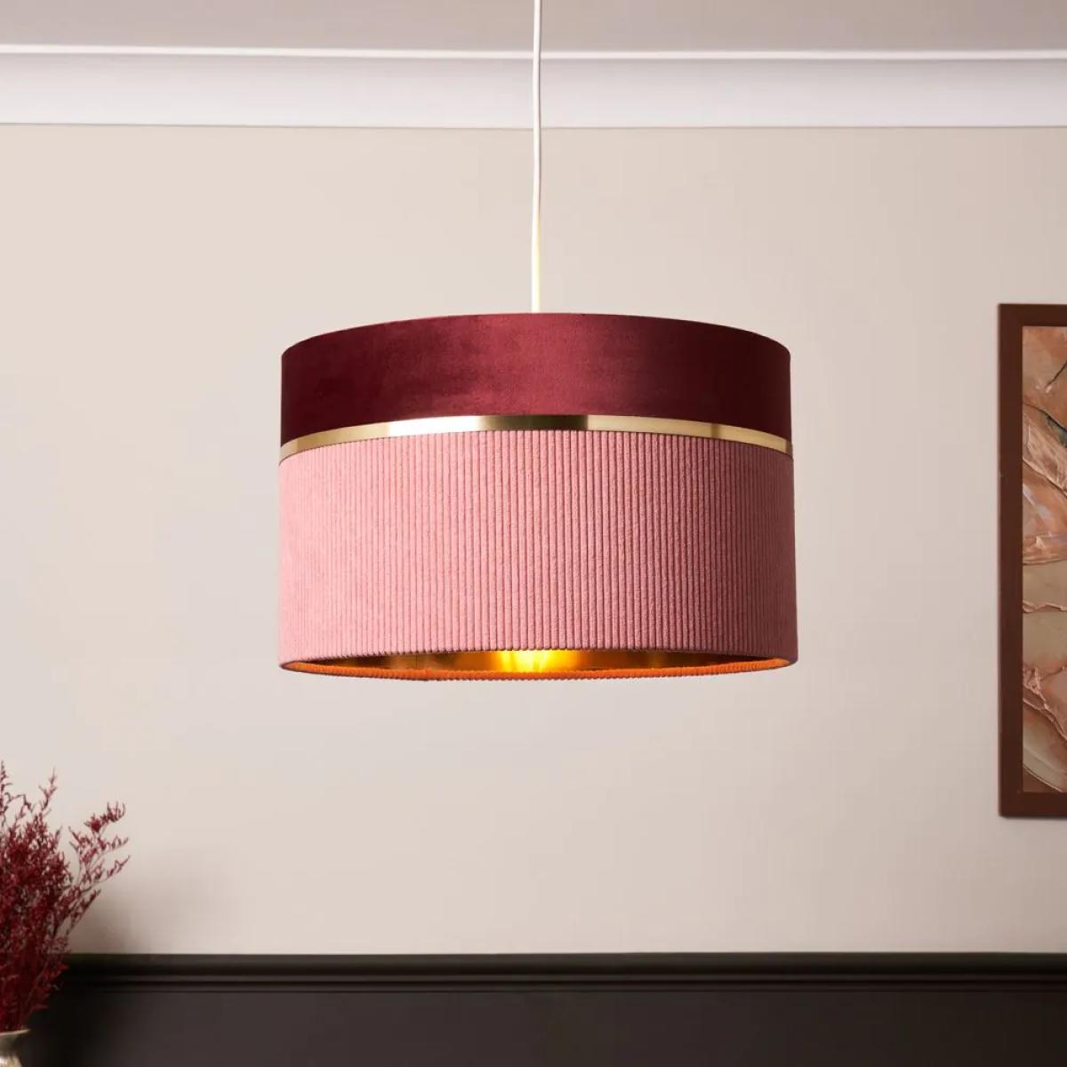 Introduce a vibrant pop of colour to your space with the Violet 40cm Mixed Fabric Easyfit Shade in Pink. This large ceiling shade creates a bold statement in living rooms or dining areas, offering a soft, glowing light that enhances any space due to the brass lining. Its warm pink tones add a playful touch to modern, eclectic, or boho-inspired interiors.