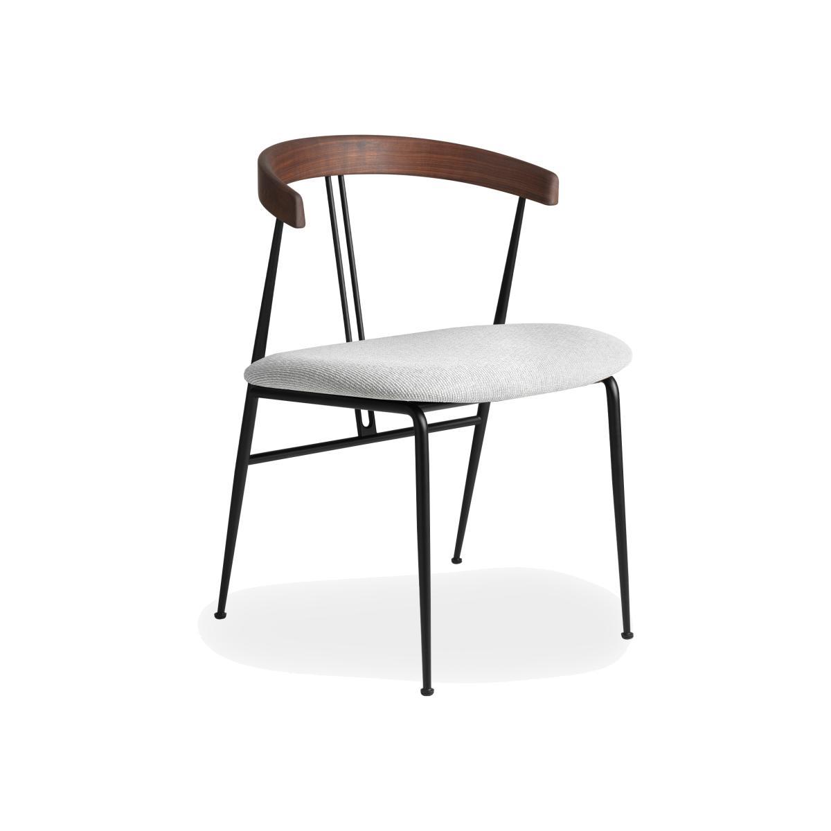Resembling a musical note on a score, Gam. Fratesi's Violin Dining Chair for GUBI is a masterclass in theatrical yet functional design. The supportive, half-armed chair exhibits a strong silhouette with a minimalist powder-coated steel profile, walnut back and elegantly tapered legs. Part-upholstered in Gabriel's Tempt fabric, the 100% polyester composition is best suited for soft seating. Founded in 2006 by architects Stine Gam and Enrico Fratesi, the award-winning Copenhagen-based design house takes its creative drive from a fusion of tradition and renewal, drawing on both designers' experiences of Danish and Italian craft traditions. Renowned for applying an experimental approach to every project, Gam Fratesi awards each design with a visible historical context and unique, fresh aesthetic.