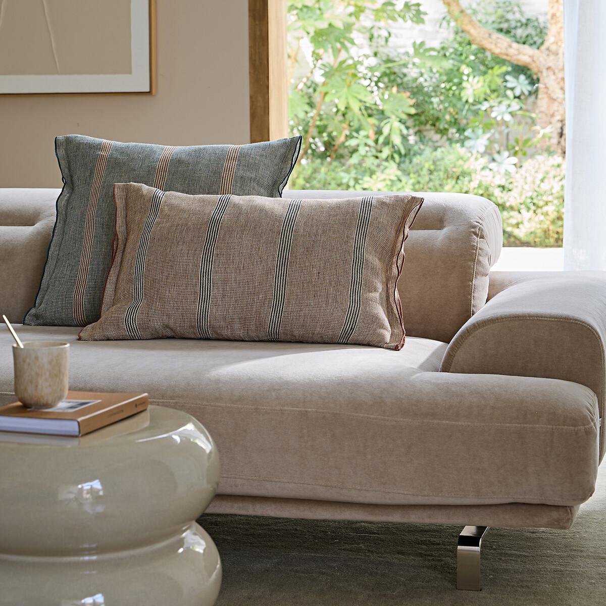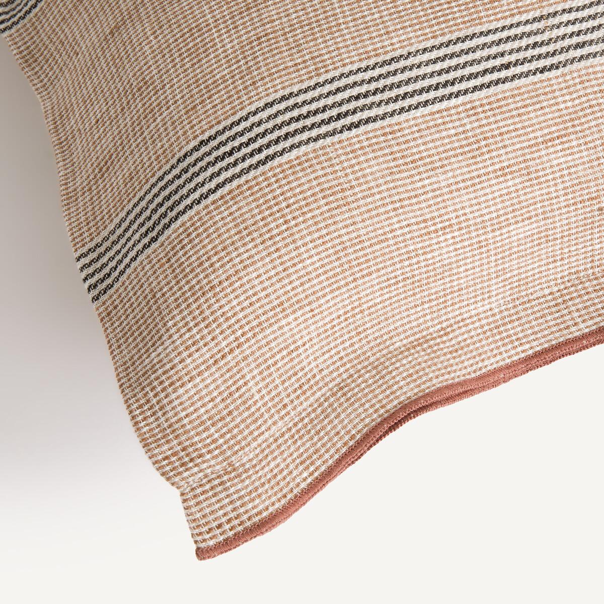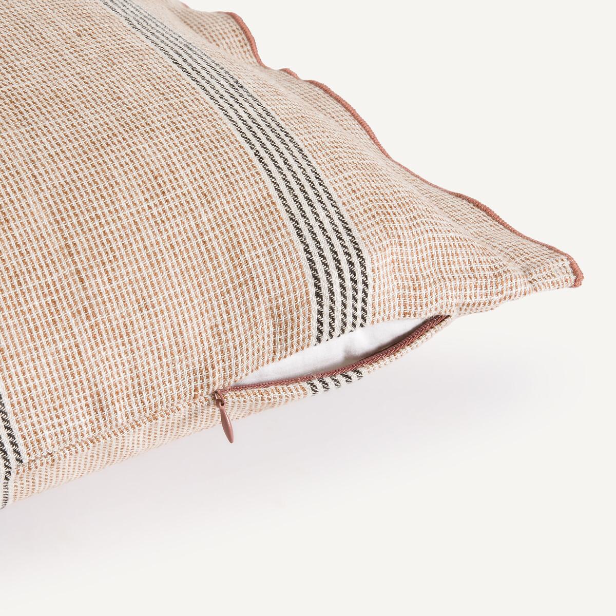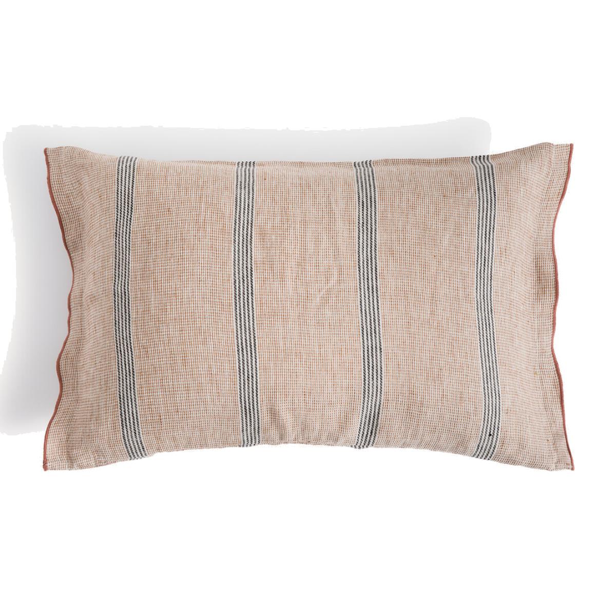 The subtle Virel cushion cover features a striped print on a woven linen background in soft tones. Product Details • 100% linen, 265g/m² • Caramel bourdon edging and double ruffle finish • Invisible tone-on-tone zip-up closure. Care Advice Follow our care tips to maintain the quality of your linens • Machine washable at 30°C • Iron at average temperature. Dimensions • 60 x 40cm • OEKO-TEX® Standard 100. Standard 100 certification by OEKO-TEX® tests textile products for harmful substances via an independent, international label.