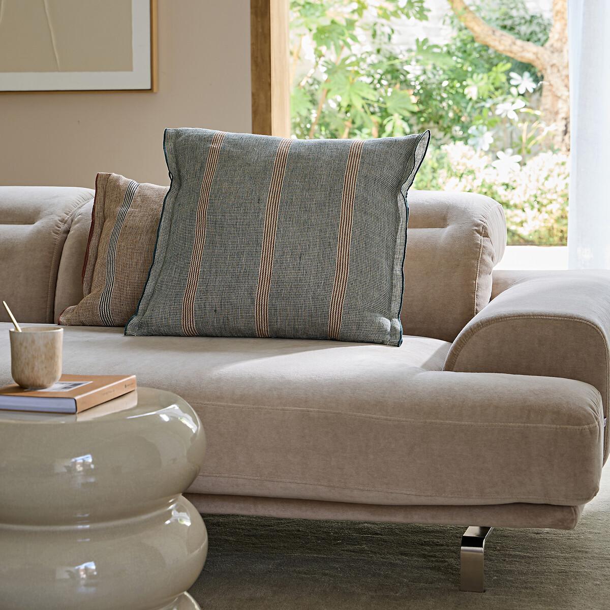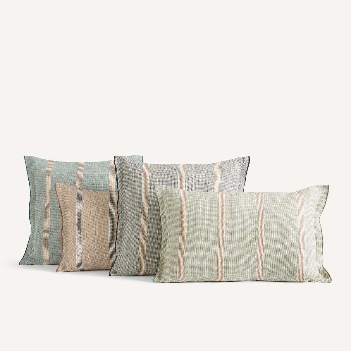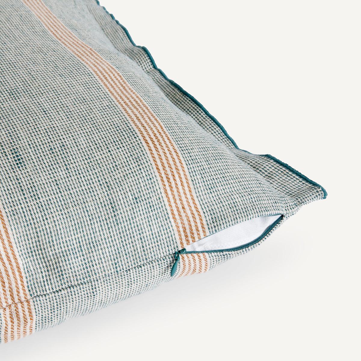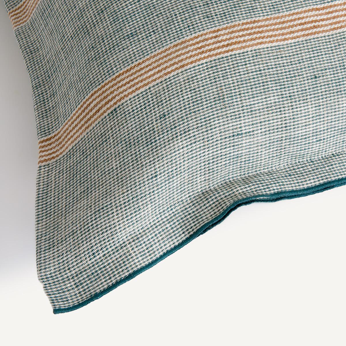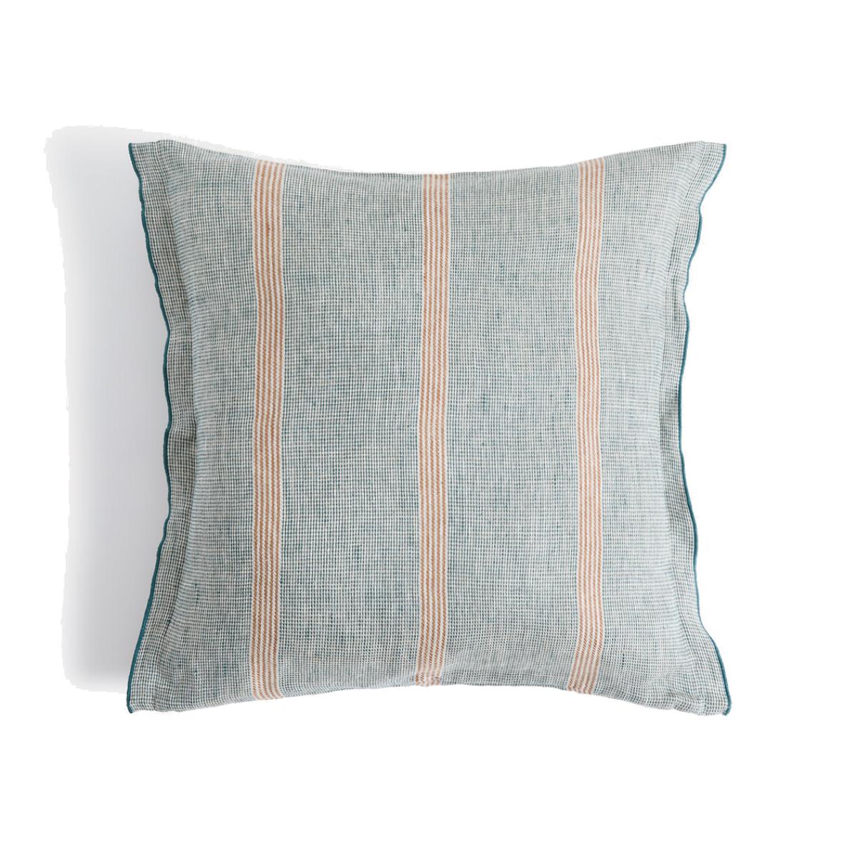 The subtle Virel cushion cover features a striped print on a woven linen background in soft tones. Product Details • 100% linen, 265g/m² • Teal bourdon edging and double ruffle finish • Invisible tone-on-tone zip-up closure. Care Advice Follow our care tips to maintain the quality of your linens • Machine washable at 30°C • Iron at average temperature. Dimensions • 50 x 50cm • OEKO-TEX® Standard 100. Standard 100 certification by OEKO-TEX® tests textile products for harmful substances via an independent, international label.