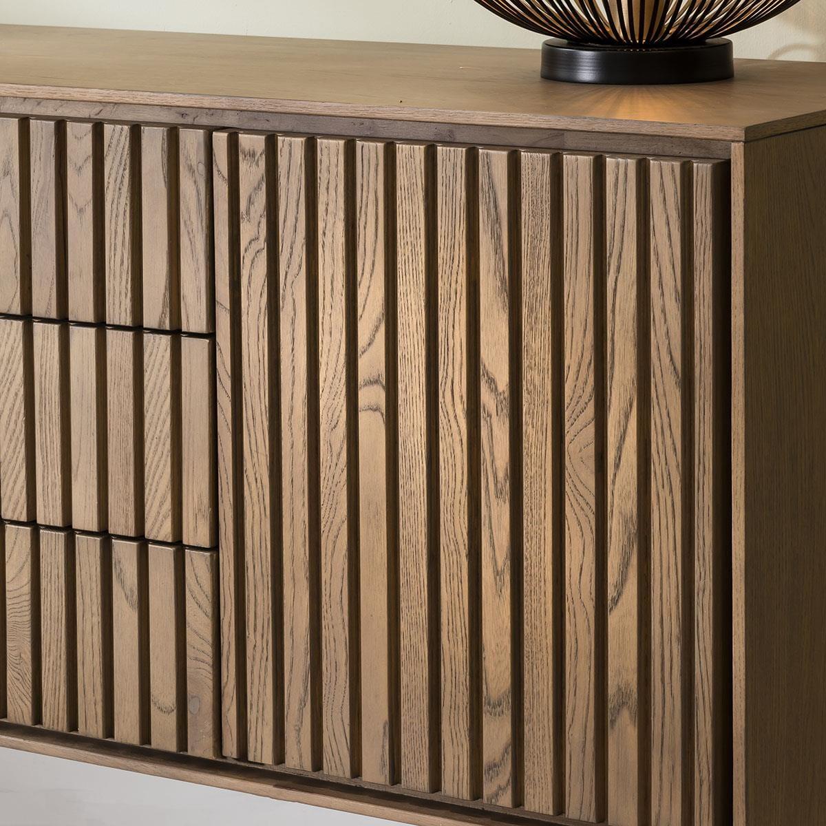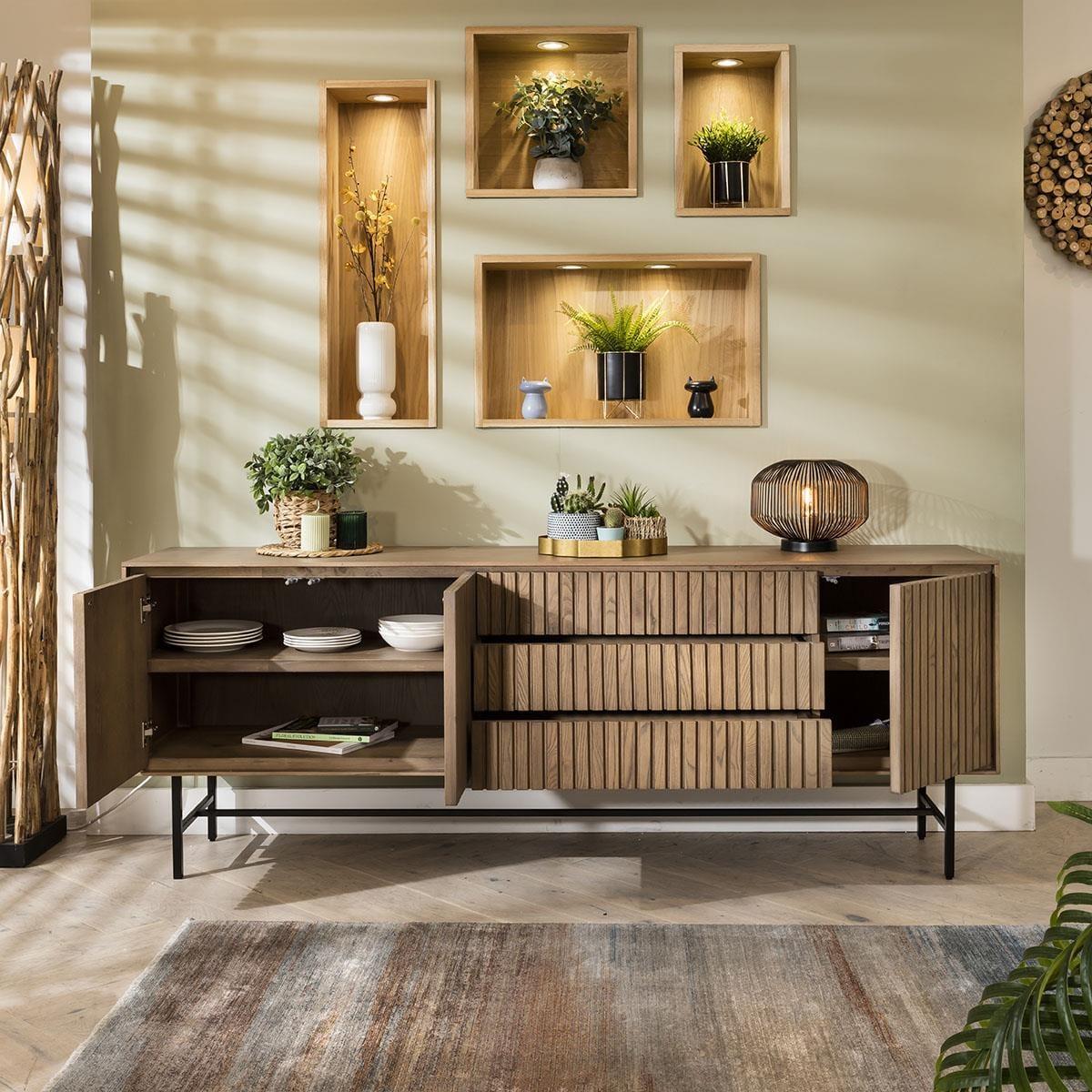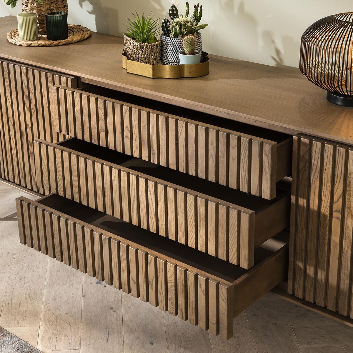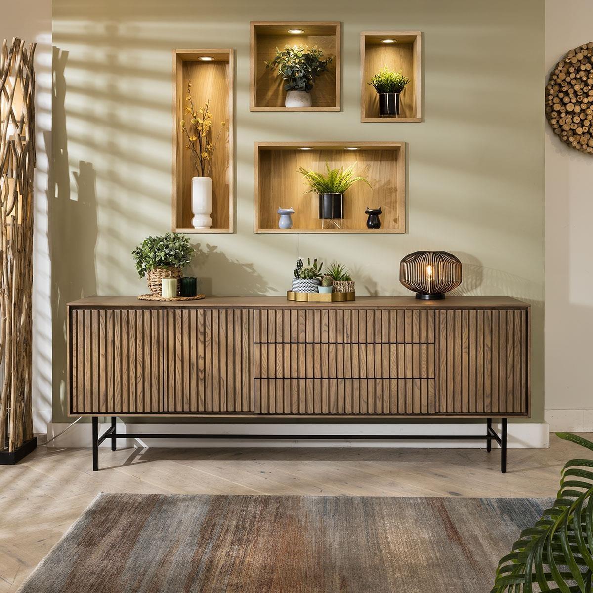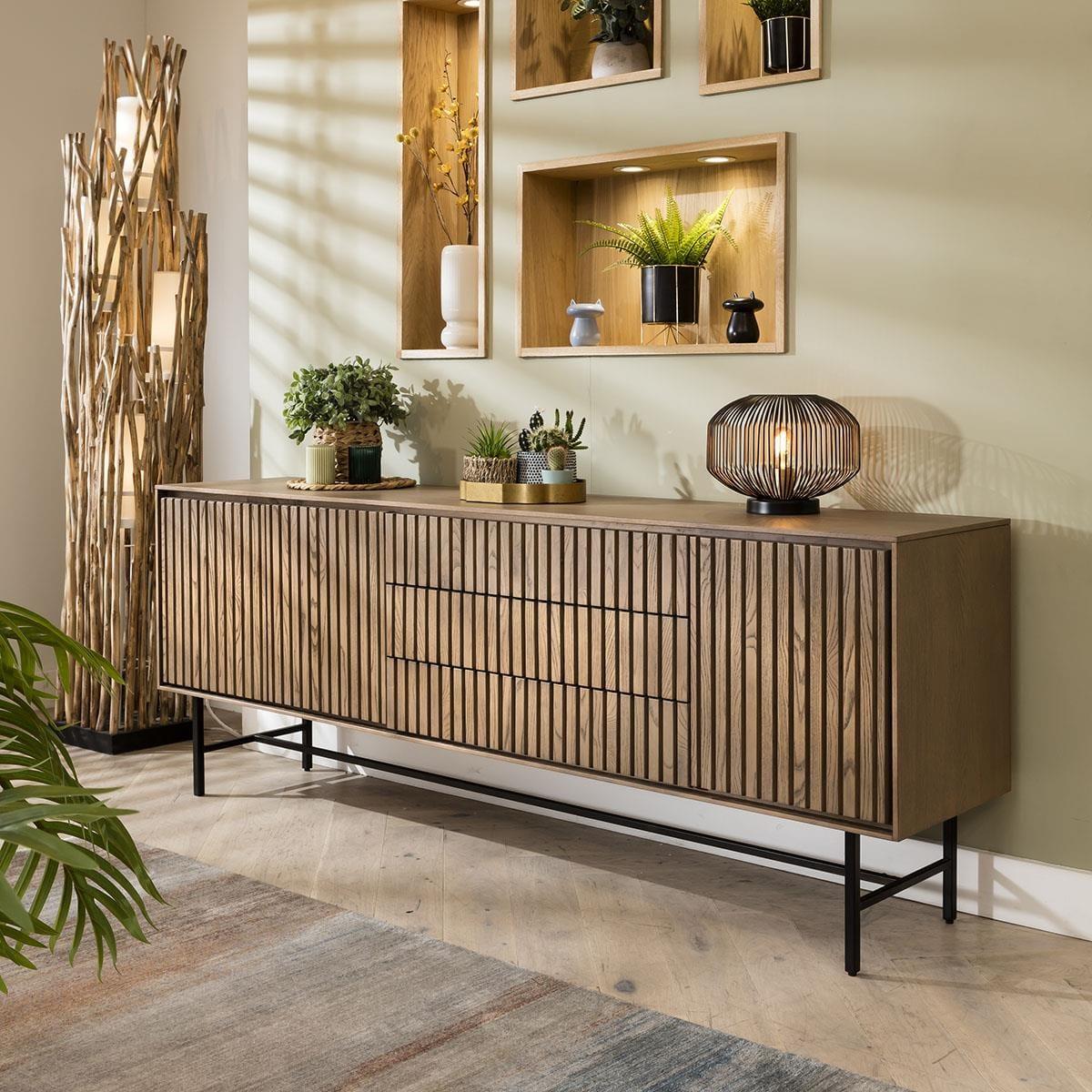 This modern Scandi wooden sideboard cabinet combines minimalist charm and functionality. Crafted with solid wood boasting a stained oak veneer, its clean lines epitomise Scandinavian design ethos. The 200cm buffets grooved front not only enhances aesthetics but also delivers acoustic advantages, with plenty of storage. This 205cm wide buffet unit offers ample storage - a spacious double-door cupboard with a fixed shelf, three generous drawers, and an additional single cupboard with a shelf. The handless design, featuring push-open catches, ensures a seamless, uncluttered appearance, while the shadow gap tracing the cabinet's edge adds a touch of subtle sophistication. Elevating the piece 25cm above the ground, the black metal base not only provides stability but also contributes to the wooden sideboard's modern allure. Standing at an overall height of 75cm, it strikes the perfect balance between functionality and style. Ideal for contemporary interiors seeking both elegance and practicality, this sideboard merges form and function effortlessly. Curated to complement your contemporary lifestyle seamlessly, with plenty of storage: double-door cupboard shelves internal dimensions W74cm D36cm H18cm, drawer internal dimensions W73cm D32cm H8cm, single cupboard shelves internal dimensions W35cm D36cm H18cm. W205cm D42cm H75cm Wooden Sideboard Buffet with Stained Finish Preassembled - Simply attach the legs