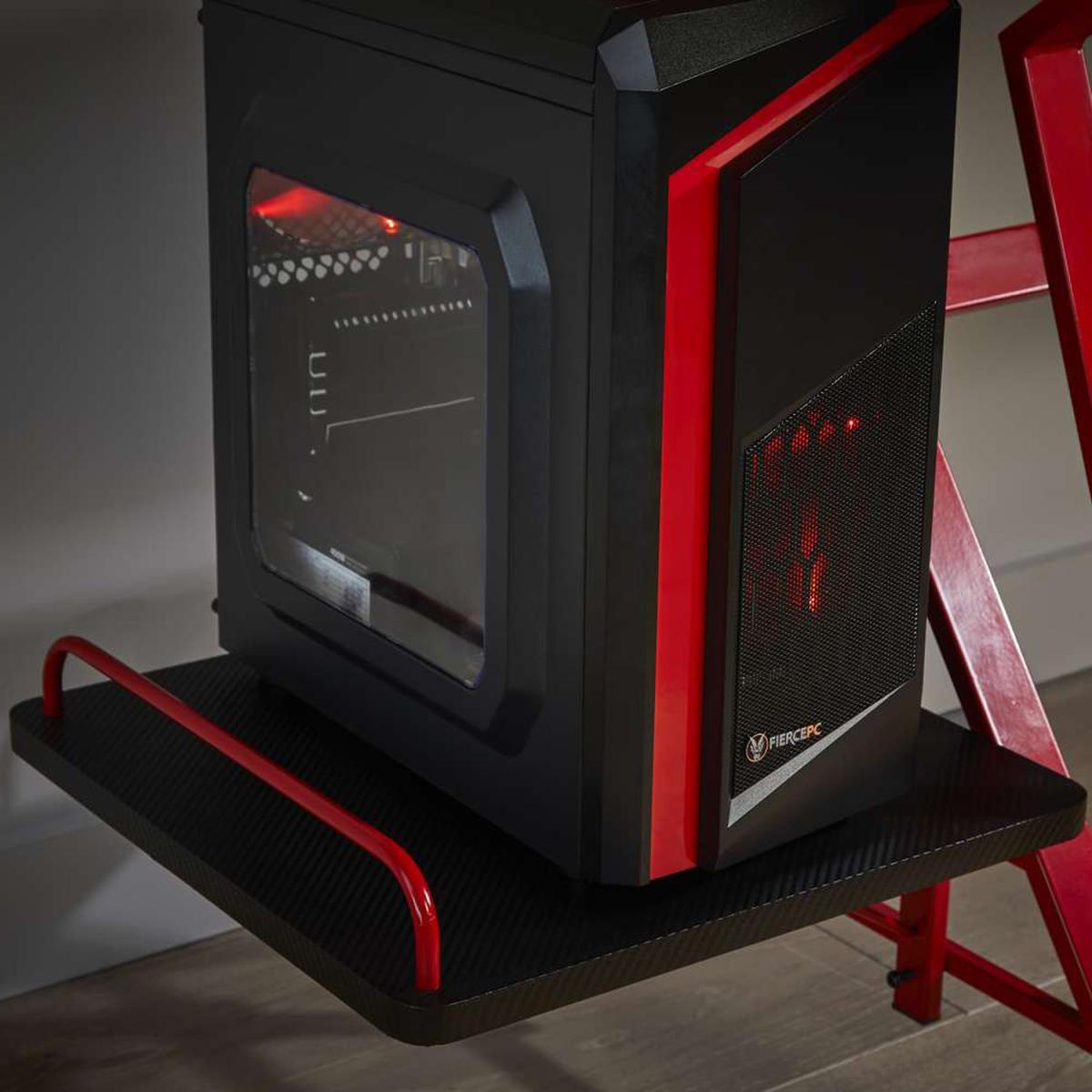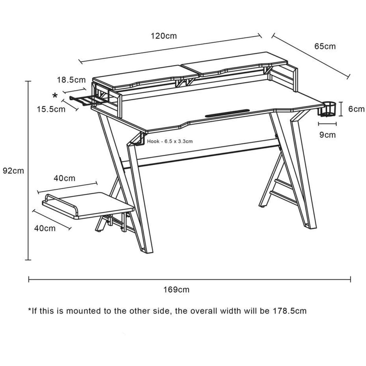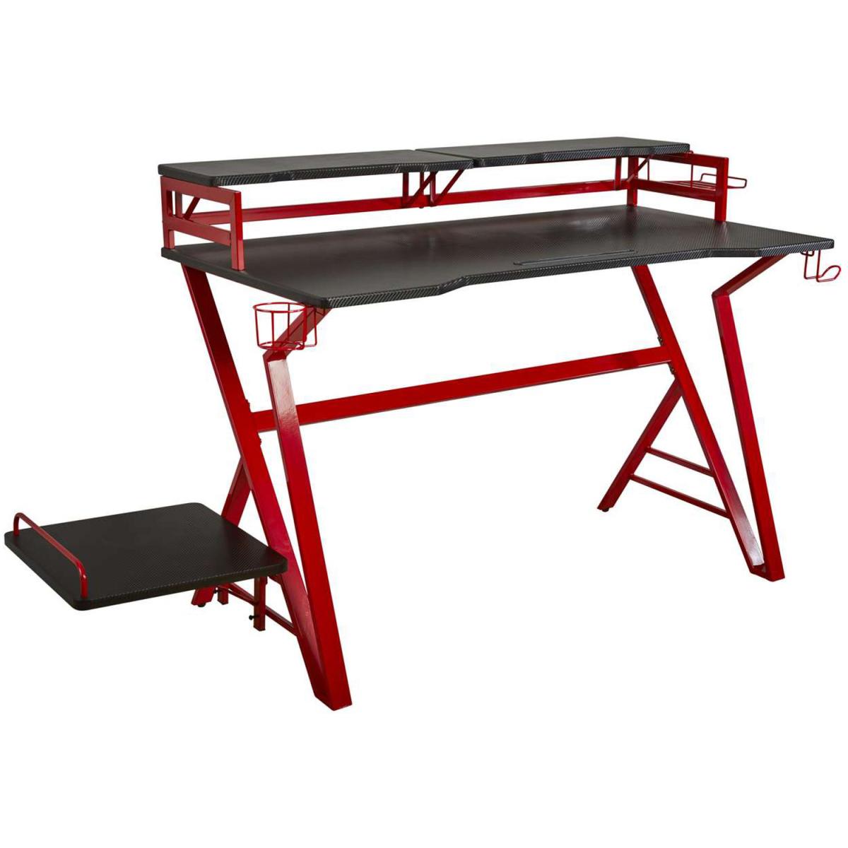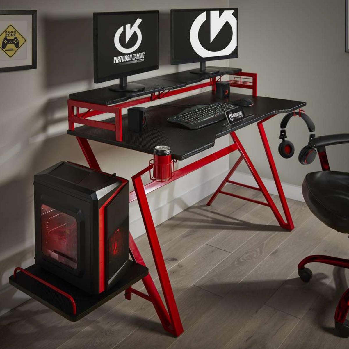PA compact yet stylish way to maximise space, the Virtuoso PRO VX01 Gaming Desk is a perfect addition to your gaming setup. The versatile gaming table includes a large monitor stand for an elevated platform style fit for dual screens and an angled metal frame for ergonomic seating. Featuring multiple headphones and accessory hooks with adjustable placements, the desk has a raised storage shelf for pc towers and consoles, finished with a large desktop area for a keyboard, mouse, folders and more. Ideal for gaming, working from home or school work and available in Red. Black, Blue White or Green Black.p
