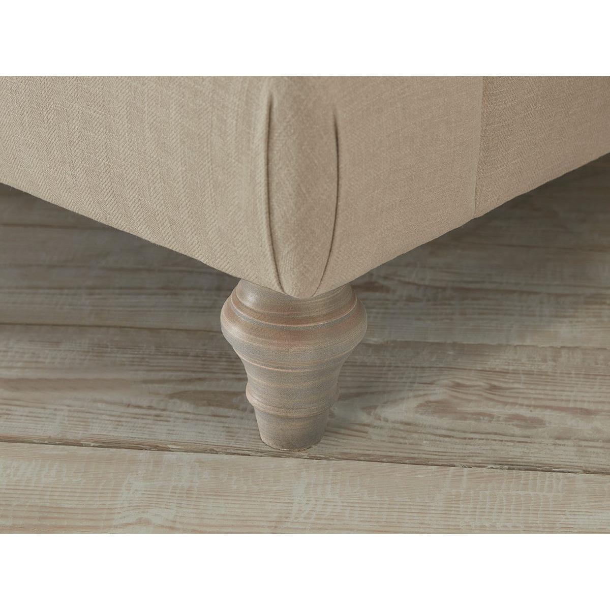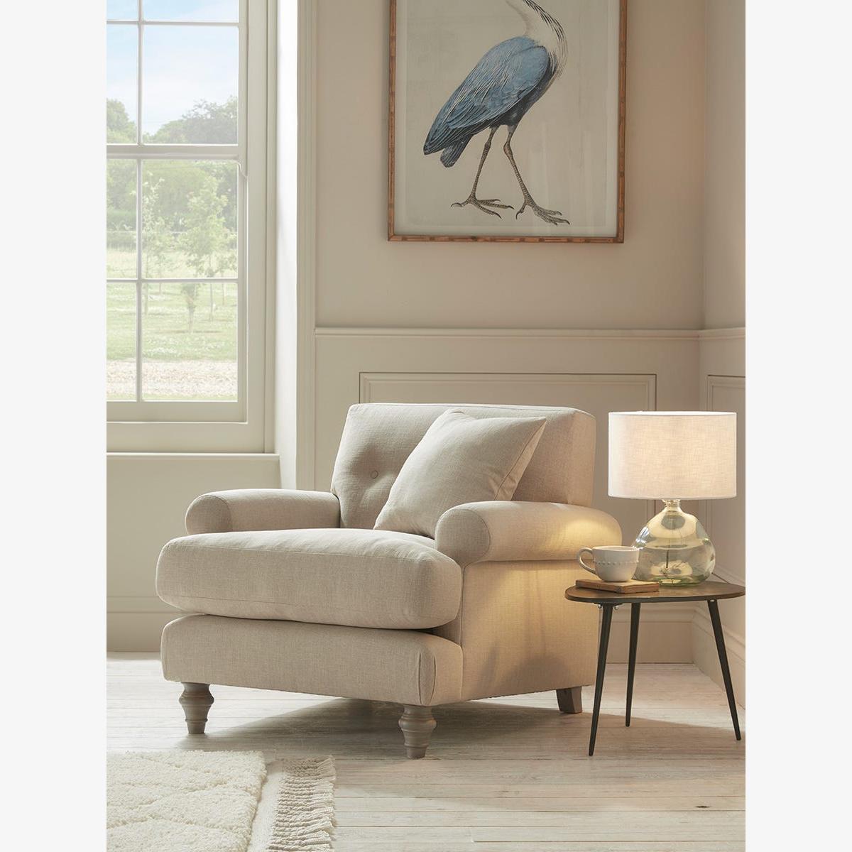 A single row of buttons is the statement feature in our captivating new Visby made to order range. With its modern take on country house styling, the Visby armchair features low scrolled arms for a spacious open feel. The seat cushion is enticingly plump with feather and foam fill. A matching scatter cushion adds extra comfort and carved oak legs enhance the elegant lines. The Visby range also includes a two seater and a three seater sofa, a loveseat and an ottoman. Pictured here in our Sand Herringbone material, our Visby collection can be upholstered in a choice of 33 distinctive shades and five fabrics to suit your style. Read our Upholstery FAQs View our full Upholstery Terms and Conditions