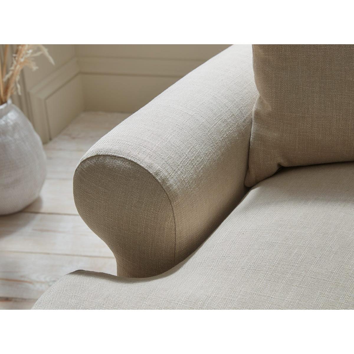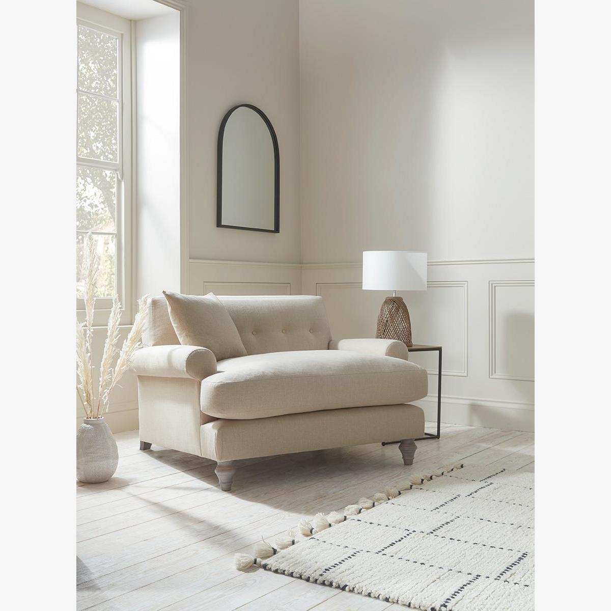 A single row of buttons is the statement feature in our captivating new Visby made to order range. With its modern take on country house styling, the cosy Visby loveseat features low scrolled arms for a spacious open feel. The seat cushion is enticingly plump with feather and foam fill and offers space to spread out or snuggle together. A matching scatter cushion adds extra comfort and carved oak legs enhance the elegant lines. The Visby range also includes a two seater and a three seater sofa, an armchair and an ottoman. Pictured here in our Sand Herringbone material, our Visby collection can be upholstered in a choice of 33 distinctive shades and five fabrics to suit your style. Read our Upholstery FAQs View our full Upholstery Terms and Conditions.