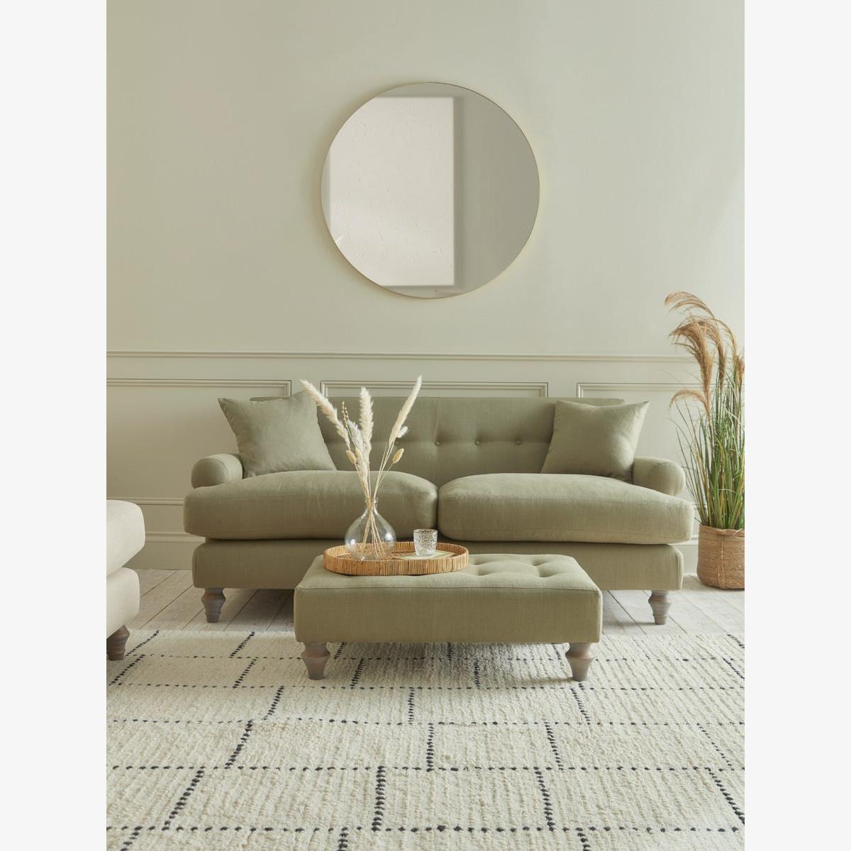 A single row of buttons is the statement feature in our captivating new Visby made to order range. With its modern take on country house styling, the sofa features low scrolled arms for a spacious open feel. The two seat cushions are enticingly plump with feather and foam fill. Matching scatter cushions add extra comfort and carved oak legs enhance the elegant lines. The Visby range also includes a loveseat, an armchair and an ottoman. Pictured here in our Fern Herringbone material, our Visby collection can be upholstered in a choice of 33 distinctive shades and five fabrics to suit your style. Read our Upholstery FAQs View our full Upholstery Terms and Conditions