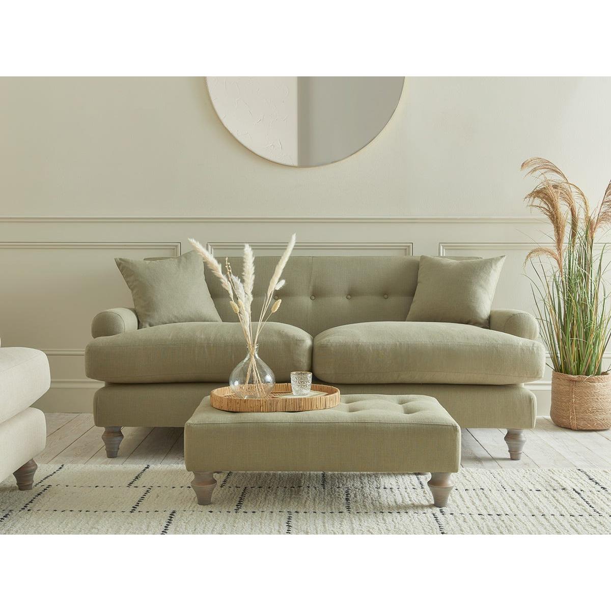 A single row of buttons is the statement feature in our captivating new Visby made to order range. With its modern take on country house styling, the sofa features low scrolled arms for a spacious open feel. The two seat cushions are enticingly plump with feather and foam fill. Matching scatter cushions add extra comfort and carved oak legs enhance the elegant lines. The Visby range also includes a loveseat, an armchair and an ottoman. Pictured here in our Fern Herringbone material, our Visby collection can be upholstered in a choice of 33 distinctive shades and five fabrics to suit your style. Read our Upholstery FAQs View our full Upholstery Terms and Conditions