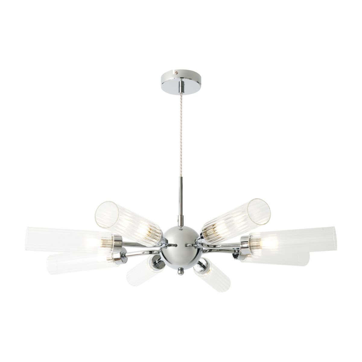 Exude modern luxury with the Visconte Praiano 8 Light Ceiling Pendant in Chrome. The captivating ribbed glass shades and adjustable height make this 8 light ceiling fixture a perfect statement addition for any room. The 8 Lights of this ceiling pendant illuminate your space with a striking radiance.