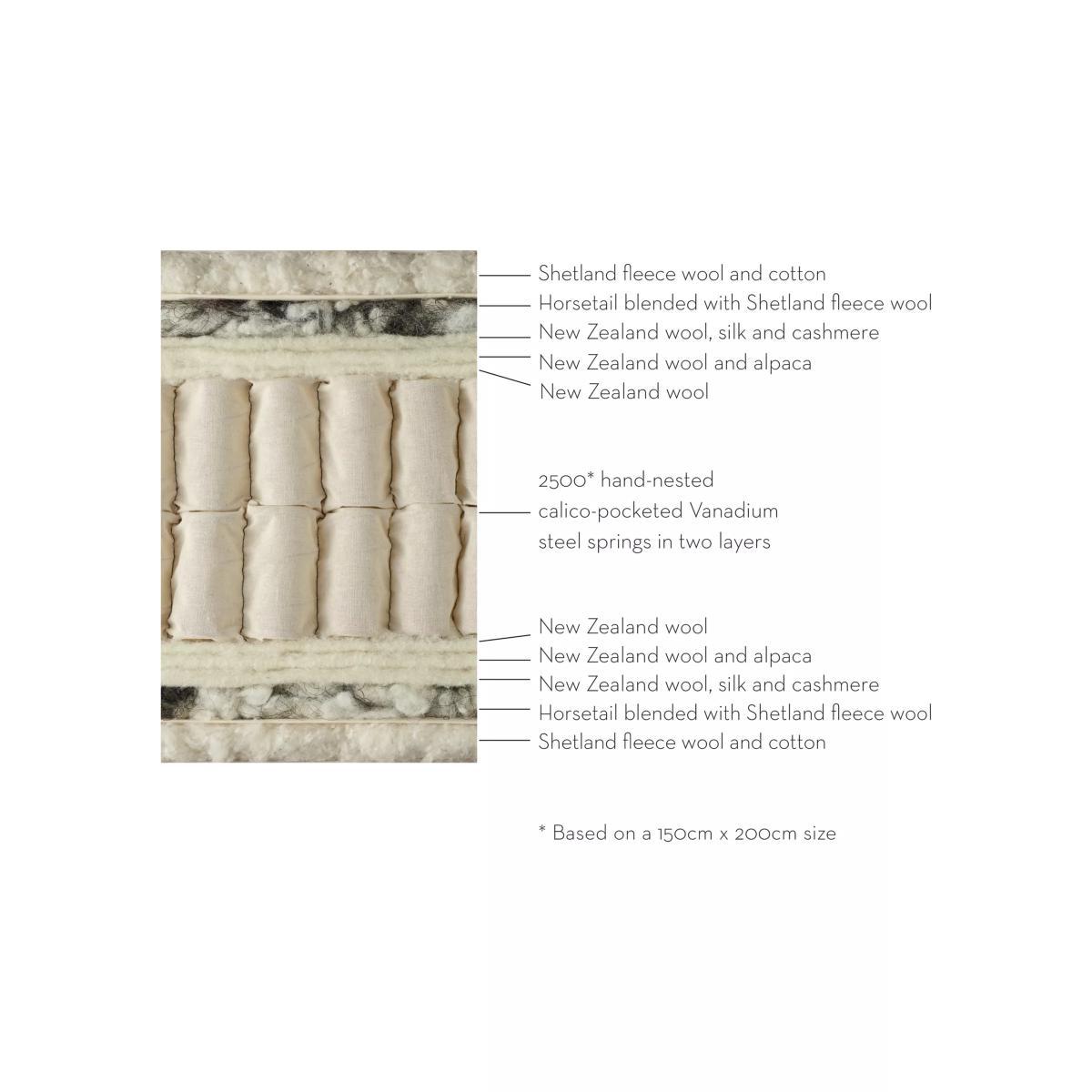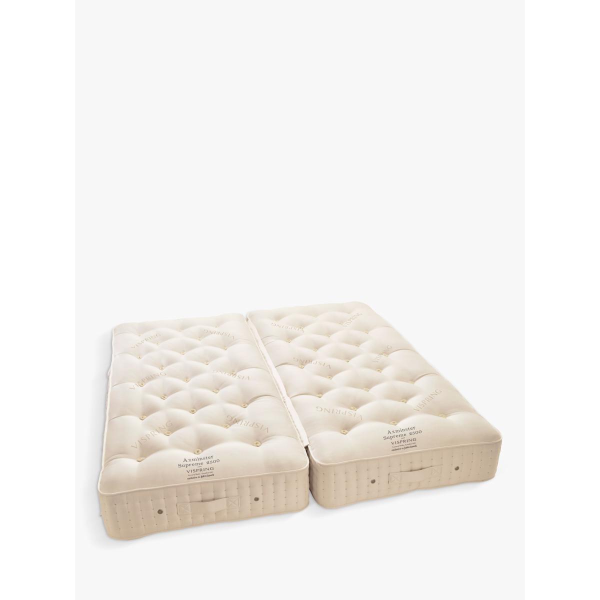 Made in the UK The Axminster Supreme 2500 range of mattreses from Vispring are upolstered in the finest natural fibres and feature a pocketed Vanadium steel spring system. Handmade in Plymouth with a total of 2500 pocket springs in the king size model, this range offers deep and exceptional support each night and a medium tension level of comfort. This zip link model can be used as one large mattress or as two independent mattresses depending on your needs. Natural Materials Designed with premium layers of natural fillings, that include; fire-retardant New Zealand wool, silk and cashmere, this mattress delivers a soft, supportive and luxurious sleeping experience. Natural materials absorb humidity, and its blend of cotton maintains climate management throughout the night. You'll feel cool and comfortable, while ensuring that your sleep environment stays hygienic. Vanadium Steel Pocket Springs This support system is designed with hand-nested springs in a honeycomb formation, to offer tailored, responsive and effective support for your entire body. Enveloped by the natural fillings, pocket springs also help to maintain the structure of your mattress. Four rows of hand side-stitching and cotton felt tufts lend a premium finish. Vispring 30 Year Guarantee To register your guarantee, please click Try before you buy This is an important purchase and it’s worthwhile to try your choice of mattress in store to make sure it's right for you. Our store Partners will be able to tell you more about its benefits, and recommend options based on your needs.