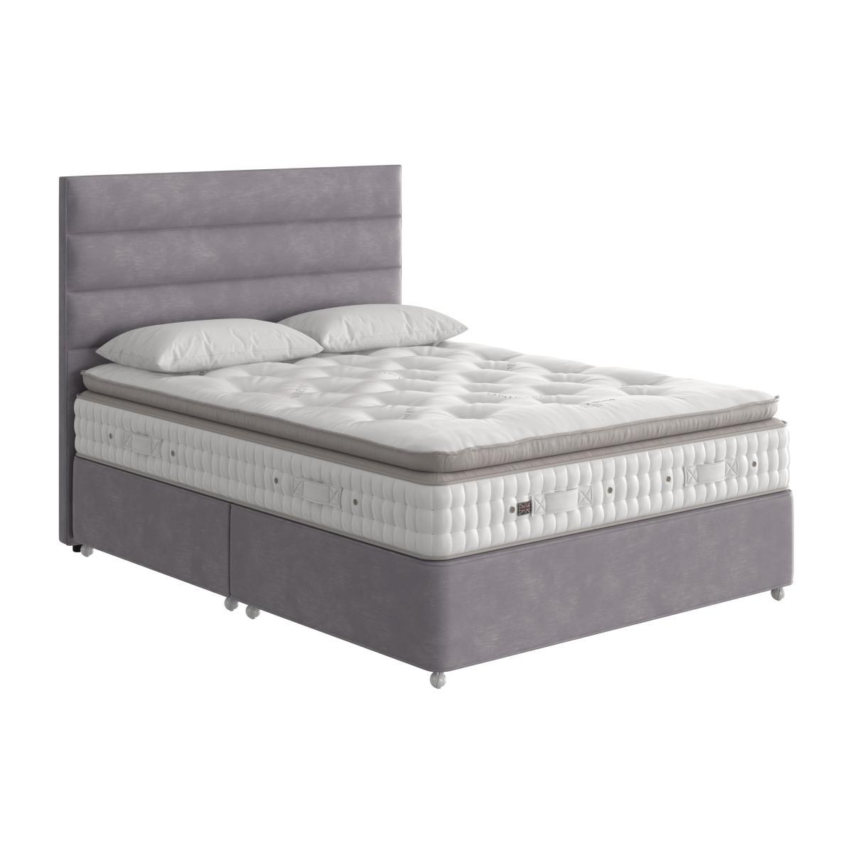 Sleep like royalty or, at least, like landed gentry with this superb divan set from master bed crafter Vispring. We love the sumptuous pillow top with two layers of micro springs and the wide choice of drawer options. Why you’ll love it. Beautiful divan set features one of Vispring’s very first pillow top mattresses. Luxurious comfort crafted to exceptionally high standards. Offers wonderful support thanks to 1326 pocket springs in king size. Pillow top has 2 micro spring layers and resilient fillings for softness that helps to reduce sagging. Natural wool and cotton fillings are hypoallergenic. In a choice of spring tensions for personalised comfort. Wide choice of fine fabrics for the divan base. Five different optional storage drawer configurations. The range also includes a standalone mattress. Handmade to order in Britain by Vispring. Exclusively available at Furniture Village. What you need to know. Headboard shown is available seperately. Mattress type: Pocket spring. Depth: 31 cm including a 10 cm pillow top. Firmness: Soft, medium, firm; split tension available in king and super king sizes. Springs: 1326 hand-nested, six-coil steel pocket springs in king size. Pillow top: Yes, with micro springs, real Shetland wool, Airstream Memory Wool and Cocolok. Fillings: British wool, British cotton. Borders: Wool-upholstered, 2 rows of hand side-stitching, horizontal handles, air vents. Edge support: Hand side stitched to create edges that support just the same as in the middle of the bed. Cover: 100% viscose damask ticking. Requires turning: No. Base type: Traditional fully pocket sprung base; 600 pocket springs in king size. Sizes: Double, king, super king, super king zip and link. Mattress care: Air for 4 hours before using to remove any odour. Allow at least 4 hours for springs to settle and for mattress to attain its full size. Indentations caused by settlement of fillings or body weight are normal and are not considered defects. If used on a slatted bed frame, slats must be no more than 7 cm apart. Rotate regularly.