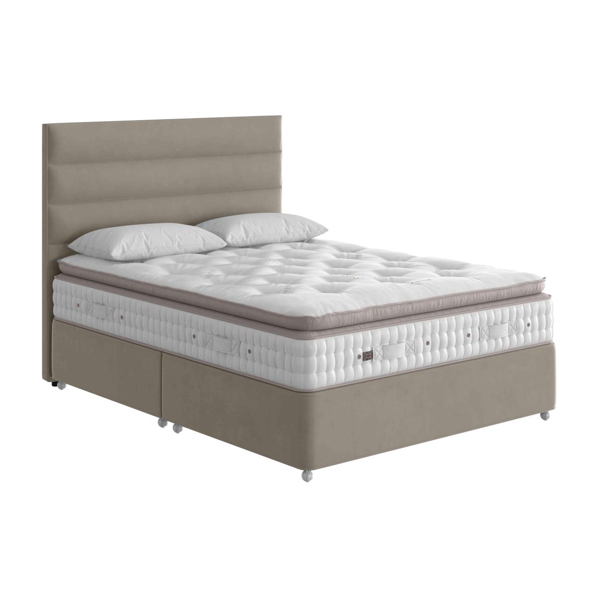World-famous for its luxury beds and mattresses, Vispring has exceeded itself with the Baroness collection. Featuring one of Vispring's very first pillow top mattresses, the range showcases the high-quality materials – super-supportive vanadium steel pocket springs, gorgeous natural fillings – for which this brand is rightly famous. And, like all Vispring mattresses, it’s handcrafted with painstaking attention to detail. The pillow top even has two layers of micro springs. Sleep like royalty or, at least, like landed gentry with this superb divan set from master bed crafter Vispring. We love the sumptuous pillow top with two layers of micro springs and the wide choice of drawer options. Why you’ll love it Beautiful divan set features one of Vispring’s very first pillow top mattresses. Luxurious comfort crafted to exceptionally high standards. Offers wonderful support thanks to 1326 pocket springs in king size. Pillow top has 2 micro spring layers and resilient fillings for softness that helps to reduce sagging. Natural wool and cotton fillings are hypoallergenic. In a choice of spring tensions for personalised comfort. Wide choice of fine fabrics for the divan base. Five different optional storage drawer configurations. The range also includes a standalone mattress. Handmade to order in Britain by Vispring. Exclusively available at Furniture Village. What you need to know Headboard shown is available seperately. Mattress type: Pocket spring. Depth: 31 cm including a 10 cm pillow top. Firmness:Soft, medium, firm; split tension available in king and super king sizes. Springs: 1326 hand-nested, six-coil steel pocket springs in king size. Pillow top:Yes, with micro springs, real Shetland wool, Airstream Memory Wool and Cocolok. Fillings: British wool, British cotton. Borders: Wool-upholstered, 2 rows of hand side-stitching, horizontal handles, air vents. Edge support: Hand side stitched to create edges that support just the same as in the middle of the bed Cover: 100% viscose damask ticking. Requires turning: No. Base type: Traditional fully pocket sprung base; 600 pocket springs in king size. Sizes: Double, king, super king, super king zip and link. Mattress care:Air for 4 hours before using to remove any odour. Allow at least 4 hours for springs to settle and for mattress to attain its full size. Indentations caused by settlement of fillings or body weight are normal and are not considered defects. If used on a slatted bed frame, slats must be no more than 7 cm apart. Rotate regularly.