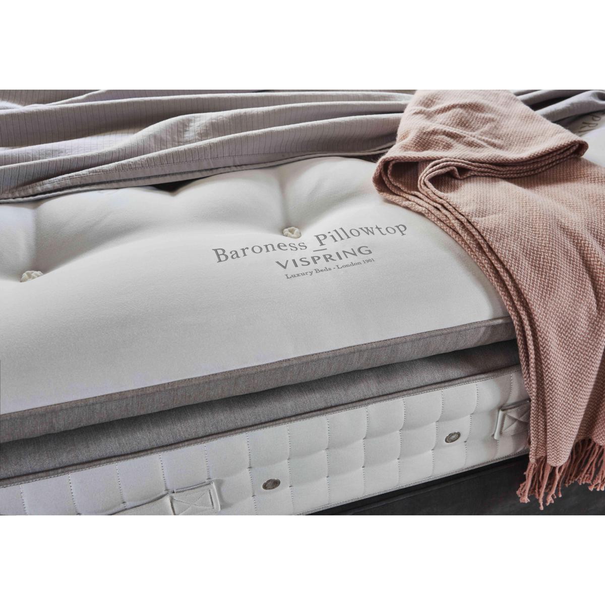 World-famous for its luxury beds and mattresses, Vispring has exceeded itself with the Baroness collection. Featuring one of Vispring's very first pillow top mattresses, the range showcases the high-quality materials – super-supportive vanadium steel pocket springs, gorgeous natural fillings – for which this brand is rightly famous. And, like all Vispring mattresses, it’s handcrafted with painstaking attention to detail. The pillow top even has two layers of micro springs. Sleep like royalty or, at least, like landed gentry with this superb divan set from master bed crafter Vispring. We love the sumptuous pillow top with two layers of micro springs and the wide choice of drawer options. Why you’ll love it Beautiful divan set features one of Vispring’s very first pillow top mattresses. Luxurious comfort crafted to exceptionally high standards. Offers wonderful support thanks to 1326 pocket springs in king size. Pillow top has 2 micro spring layers and resilient fillings for softness that helps to reduce sagging. Natural wool and cotton fillings are hypoallergenic. In a choice of spring tensions for personalised comfort. Wide choice of fine fabrics for the divan base. Five different optional storage drawer configurations. The range also includes a standalone mattress. Handmade to order in Britain by Vispring. Exclusively available at Furniture Village. What you need to know Headboard shown is available seperately. Mattress type: Pocket spring. Depth: 31 cm including a 10 cm pillow top. Firmness:Soft, medium, firm; split tension available in king and super king sizes. Springs: 1326 hand-nested, six-coil steel pocket springs in king size. Pillow top:Yes, with micro springs, real Shetland wool, Airstream Memory Wool and Cocolok. Fillings: British wool, British cotton. Borders: Wool-upholstered, 2 rows of hand side-stitching, horizontal handles, air vents. Edge support: Hand side stitched to create edges that support just the same as in the middle of the bed Cover: 100% viscose damask ticking. Requires turning: No. Base type: Traditional fully pocket sprung base; 600 pocket springs in king size. Sizes: Double, king, super king, super king zip and link. Mattress care:Air for 4 hours before using to remove any odour. Allow at least 4 hours for springs to settle and for mattress to attain its full size. Indentations caused by settlement of fillings or body weight are normal and are not considered defects. If used on a slatted bed frame, slats must be no more than 7 cm apart. Rotate regularly.