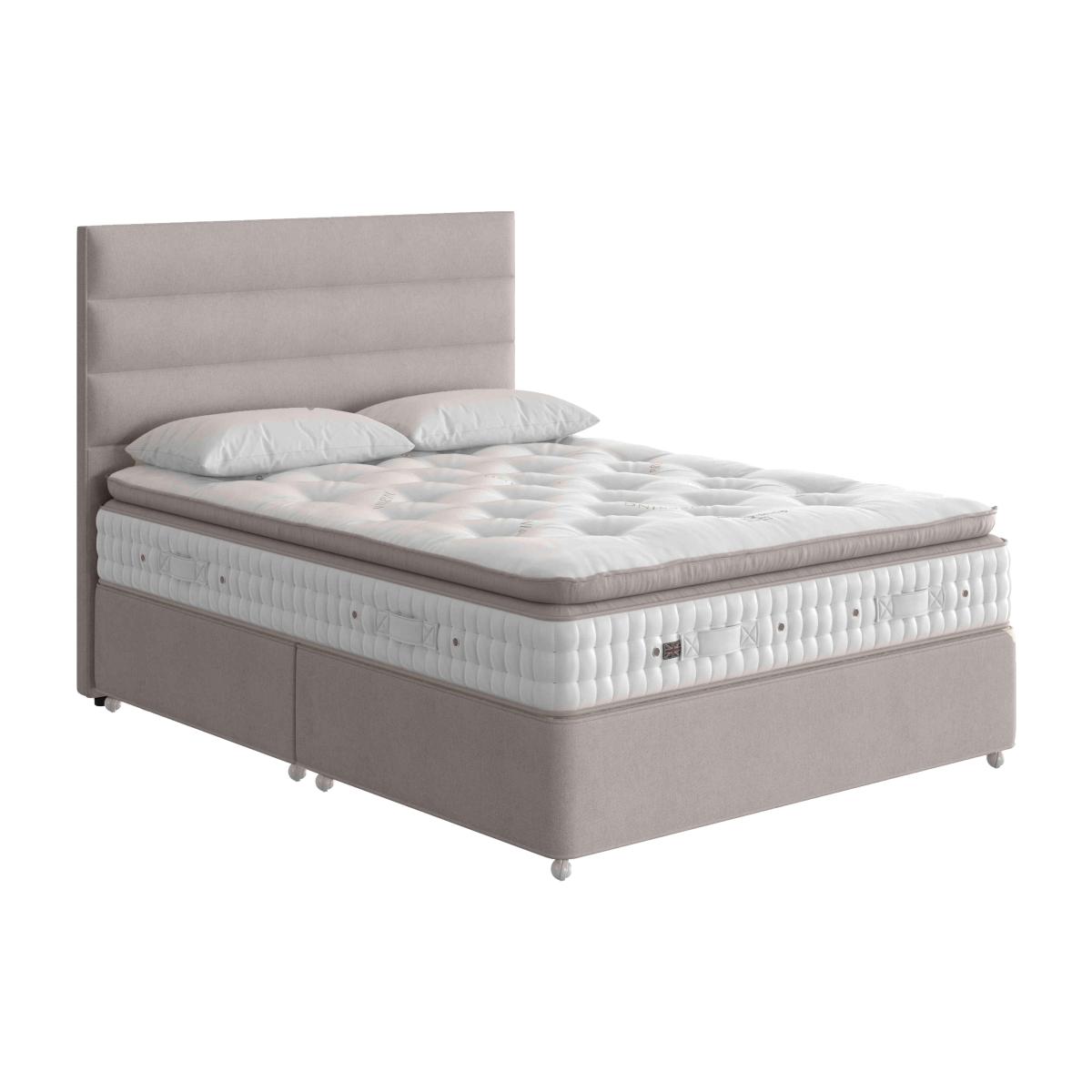 World-famous for its luxury beds and mattresses, Vispring has exceeded itself with the Baroness collection. Featuring one of Vispring's very first pillow top mattresses, the range showcases the high-quality materials – super-supportive vanadium steel pocket springs, gorgeous natural fillings – for which this brand is rightly famous. And, like all Vispring mattresses, it’s handcrafted with painstaking attention to detail. The pillow top even has two layers of micro springs. Sleep like royalty or, at least, like landed gentry with this superb divan set from master bed crafter Vispring. We love the sumptuous pillow top with two layers of micro springs and the wide choice of drawer options. Why you’ll love it Beautiful divan set features one of Vispring’s very first pillow top mattresses. Luxurious comfort crafted to exceptionally high standards. Offers wonderful support thanks to 1326 pocket springs in king size. Pillow top has 2 micro spring layers and resilient fillings for softness that helps to reduce sagging. Natural wool and cotton fillings are hypoallergenic. In a choice of spring tensions for personalised comfort. Wide choice of fine fabrics for the divan base. Five different optional storage drawer configurations. The range also includes a standalone mattress. Handmade to order in Britain by Vispring. Exclusively available at Furniture Village. What you need to know Headboard shown is available seperately. Mattress type: Pocket spring. Depth: 31 cm including a 10 cm pillow top. Firmness:Soft, medium, firm; split tension available in king and super king sizes. Springs: 1326 hand-nested, six-coil steel pocket springs in king size. Pillow top:Yes, with micro springs, real Shetland wool, Airstream Memory Wool and Cocolok. Fillings: British wool, British cotton. Borders: Wool-upholstered, 2 rows of hand side-stitching, horizontal handles, air vents. Edge support: Hand side stitched to create edges that support just the same as in the middle of the bed Cover: 100% viscose damask ticking. Requires turning: No. Base type: Traditional fully pocket sprung base; 600 pocket springs in king size. Sizes: Double, king, super king, super king zip and link. Mattress care:Air for 4 hours before using to remove any odour. Allow at least 4 hours for springs to settle and for mattress to attain its full size. Indentations caused by settlement of fillings or body weight are normal and are not considered defects. If used on a slatted bed frame, slats must be no more than 7 cm apart. Rotate regularly.