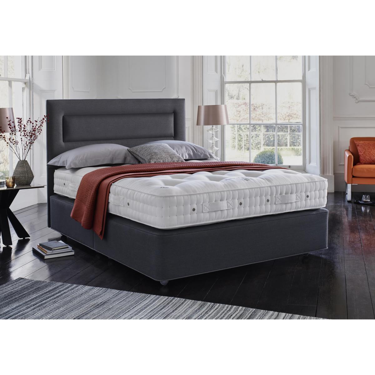 Invest in a better night’s sleep when you choose a Vispring Baronet Superb bed. The mattresses are made to order in a firm, soft, or medium comfort level. Luxurious, all natural fillings including British fleece wool, horsehair and cotton are layered around hand nested vanadium pocket springs. The sprung divans, with a choice of drawer storage, are crafted to the highest standards and upholstered in the finest Belgian fabric. Headboard is an optional extra. The Vispring Baronet divan set offers resilient support, cooling comfort and superb craftsmanship. The 21 cm mattress has 1326 six-coil springs in king size made of strong vanadium steel. They’re hand-nested in calico pockets, and layered with moisture-wicking fillings – horsehair, bonded British fleece wool and cotton, and blended British fleece wool and cotton. The mattress is covered with high-quality ticking and is hand tufted with felt washers. The wool-upholstered borders with air vents and horizontal handles are finished with two rows of hand side stitching. This well-crafted mattress comes with a sturdy timber-constructed divan base which incorporates optional storage drawers. The base has 600 hand-nested pocket springs in king size, and coir and blended British fleece wool and cotton fillings. Shown here in. Gem Prussia - Dark Grey (2027). The British-made Vispring Baronet divan set is part of the Vispring Baronet range. Product images are representative. Find out more. Please note. The mattress should be aired for four hours after delivery to freshen and remove any aroma from storage. It may take time for your mattress to attain its full size once the springs have settled to the correct position. This is due to the mattress being upright during transit. Settlement of fillings and indentations caused by body weight compressing the fillings are natural and not considered defects. This can be minimised by regular rotating (unless yours is a dual tension mattress).