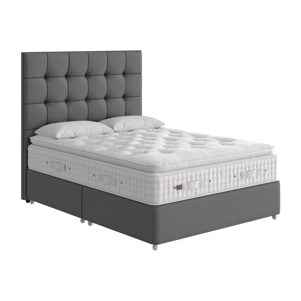 The perfect bed? If you’re looking for comfort and style, this could be the one. Along with a sumptuous pillow top mattress, the set includes a beautifully upholstered divan base with plenty of storage drawer options. Why you’ll love it. Gorgeous divan set features one of Vispring’s very first pillow top mattresses. Sumptuous comfort crafted to exceptionally high standards. Outstanding support thanks to a double layer of pocket springs – 2244 in king size. Pillow top has 2 micro spring layers and resilient fillings for softness that helps to reduce sagging. Natural wool and cotton fillings are hypoallergenic. In a choice of spring tensions for personalised comfort. Wide choice of fine fabrics for the divan base. Five different optional storage drawer configurations. The range also includes a standalone mattress. Handmade to order in Britain by Vispring. Exclusively available at Furniture Village. What you need to know. Headboard shown is available seperately. Mattress type: Pocket spring. Depth: 33 cm including a 10 cm pillow top. Firmness: Soft, medium, firm; split tension available in king and super king sizes. Springs: 2244 hand-nested, six-coil steel pocket springs in king size. Pillow top: Yes, with micro springs, real Shetland wool, Airstream Memory Wool and Cocolok. Fillings: British wool, British cotton. Borders: Wool-upholstered, 3 rows of hand side-stitching, horizontal handles, air vents. Edge support: Hand side stitched to create edges that support just the same as in the middle of the bed. Cover: 100% viscose damask ticking. Requires turning: No. Base type: Traditional sprung platform base; 600 pocket springs in king size. Sizes: Double, king, super king, super king zip and link. Mattress care: Air for 4 hours before using to remove any odour. Allow at least 4 hours for springs to settle and for mattress to attain its full size. Indentations caused by settlement of fillings or body weight are normal and are not considered defects. If used on a slatted bed frame, slats must be no more than 7 cm apart. Rotate regularly.