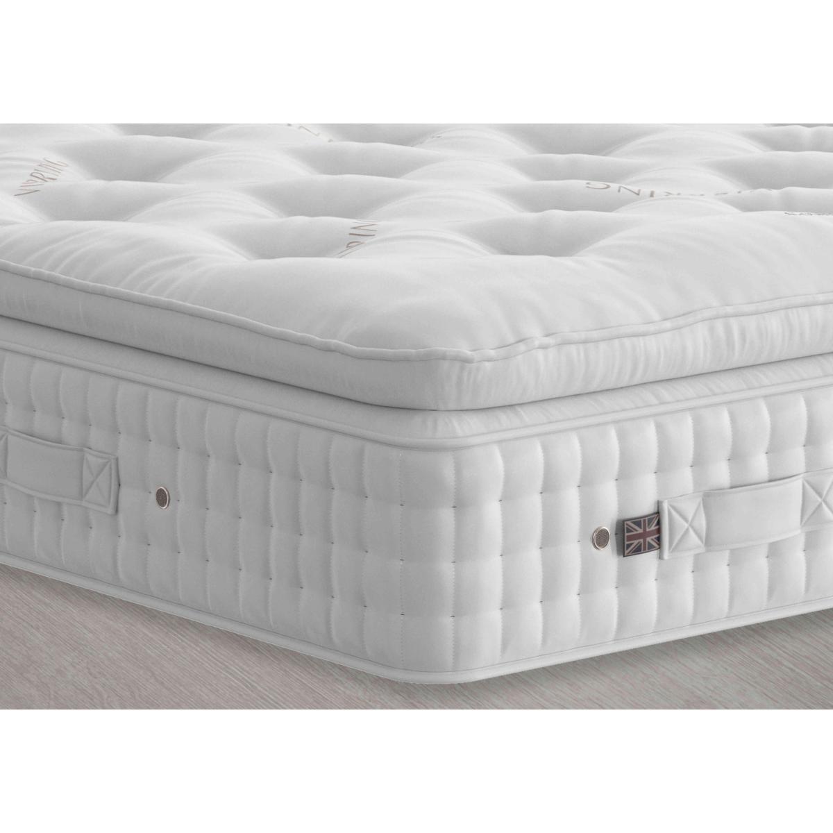 Sleep in complete luxury with this fabulous pillow top mattress from Vispring. As well as that pillow top with two layers of micro springs, you’ll enjoy superb support from a double layer of Vispring’s famously supportive pocket springs. Why you’ll love it. One of Vispring’s very first pillow top mattresses. Sumptuous comfort crafted to exceptionally high standards. Offers superb support thanks to 2244 pocket springs in king size. A double layer of supportive six-coil steel springs hand nested in calico pockets. Pillow top has 2 micro spring layers and resilient fillings for softness that helps to reduce sagging. Natural wool and cotton fillings are hypoallergenic. In a choice of spring tensions for personalised comfort. Also available as part of a stylish divan base with optional storage drawers. Handmade to order in Britain by Vispring. Exclusively available at Furniture Village. What you need to know. Mattress type: Pocket spring. Depth: 33 cm including a 10 cm pillow top. Firmness: Soft, medium, firm; split tension available in king and super king sizes. Springs: 2244 hand-nested, six-coil steel pocket springs in king size. Pillow top: Yes, with micro springs, real Shetland wool, Airstream Memory Wool and Cocolok. Fillings: British wool, British cotton. Borders: Wool-upholstered, 3 rows of hand side-stitching, horizontal handles, air vents. Edge support: Hand side stitched to create edges that support just the same as in the middle of the bed. Cover: 100% viscose damask ticking. Requires turning: No. Sizes: Double, king, super king, super king zip and link. Mattress care: Air for 4 hours before using to remove any odour. Allow at least 4 hours for springs to settle and for mattress to attain its full size. Indentations caused by settlement of fillings or body weight are normal and are not considered defects. If used on a slatted bed frame, slats must be no more than 7 cm apart. Rotate regularly.