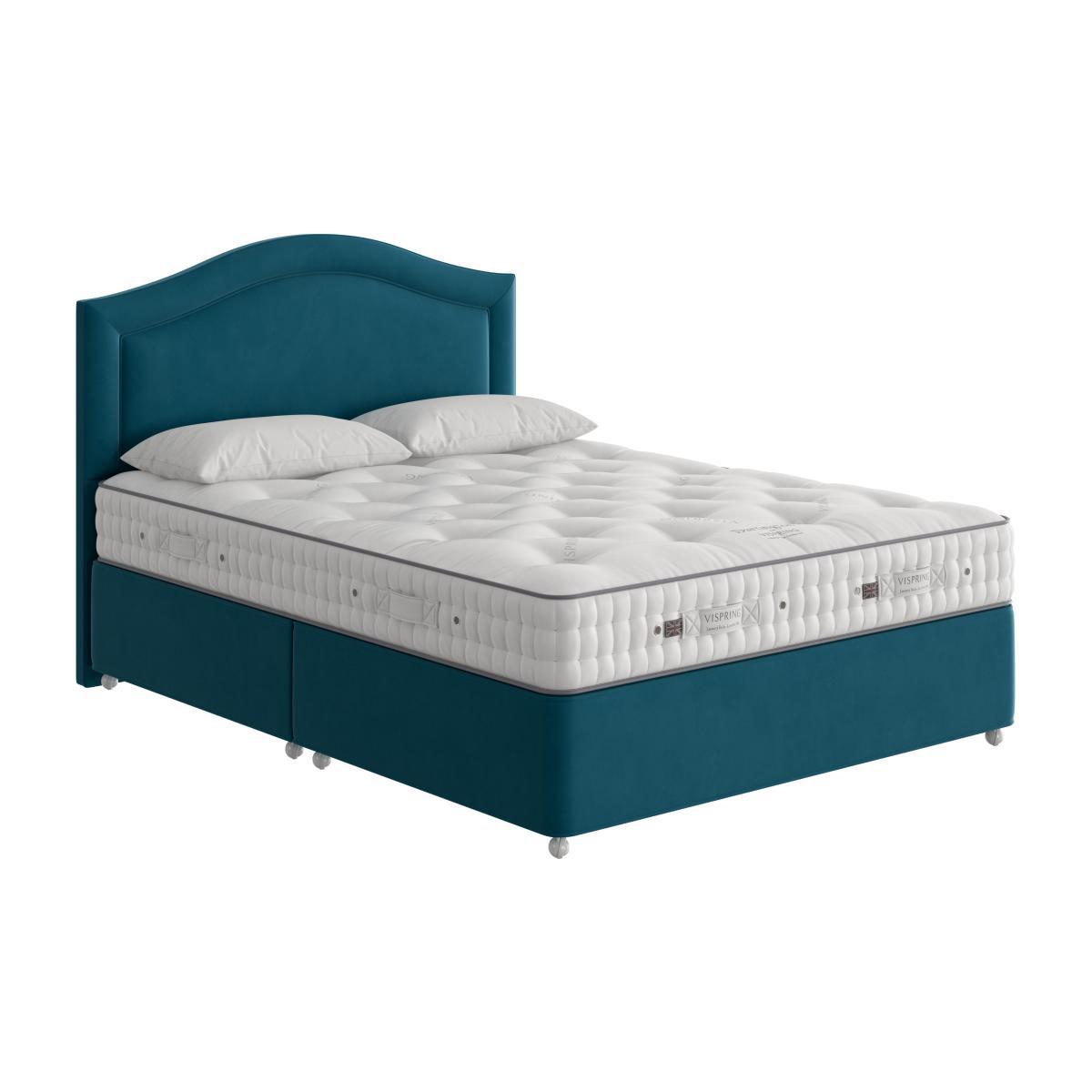 Beautifully handcrafted by Vispring, the Dartington divan bed is luxuriously comfortable. The mattress is generously filled with soft, all-natural materials including Platinum Certified British fleece wool and cotton. Within are two layers of Vispring’s famous 6 turn vanadium steel springs offering responsive support. The mattress rests on a solid timber sprung base, upholstered in a wide choice of fine upholstery. Headboard is an optional extra. Offering a cosy traditional feel, the Vispring Dartington divan set promises soothing, body-conforming comfort. This handcrafted bed comprises a 21 cm mattress with, in king size, 1558 vanadium steel pocket springs, each with six coils, that are hand-nested in calico and layered with springy and resilient fillings – bonded British fleece wool and cotton, British fleece wool, and blended British fleece wool and cotton. Covered in a fine soft ticking and hand tufted with felt washers, this mattress has wool-upholstered borders with two rows of hand side stitching, horizontal handles and air vents. It rests on a solid timber divan base with 950 pocket springs in king size and is filled with coir and blended British fleece wool and cotton. This divan base is offered with optional storage drawers. Shown here in d. Iamond oyster 2059. The Vispring Dartington divan set is part of the British-made Vispring Dartington collection. Product images are representative. Find out more. Please note. The mattress should be aired for four hours after delivery to freshen and remove any aroma from storage. It may take time for your mattress to attain its full size once the springs have settled to the correct position. This is due to the mattress being upright during transit. Settlement of fillings and indentations caused by body weight compressing the fillings are natural and not considered defects. This can be minimised by regular rotating (unless yours is a dual tension mattress).