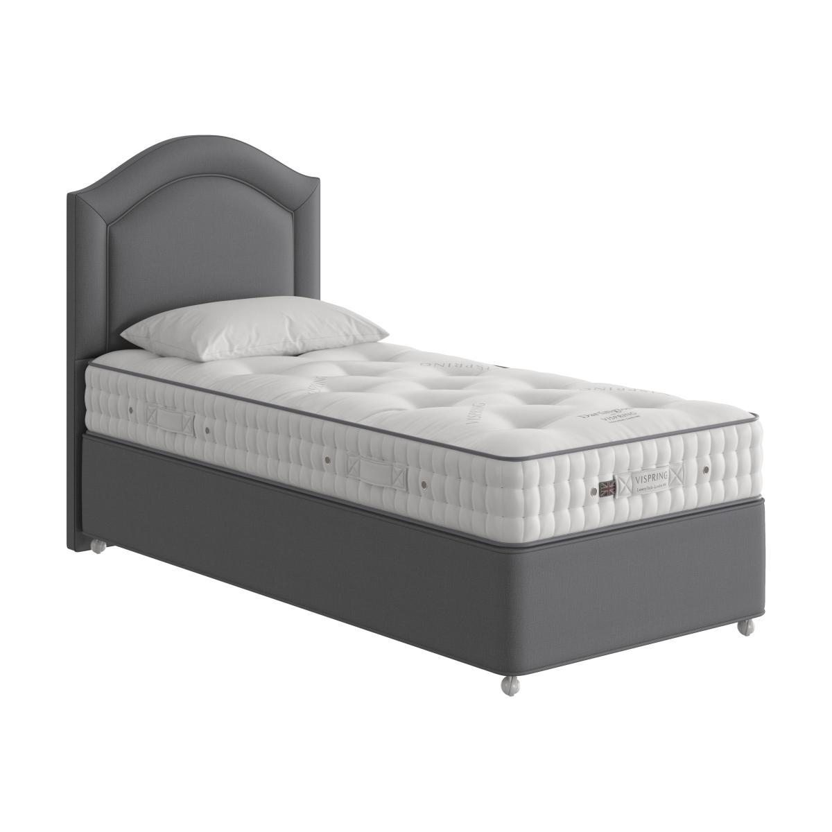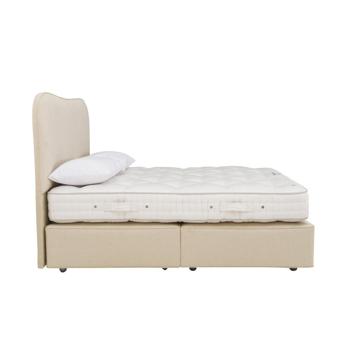 Beautifully handcrafted by Vispring, the Dartington divan bed is luxuriously comfortable. The mattress is generously filled with soft, all-natural materials including Platinum Certified British fleece wool and cotton. Within are two layers of Vispring’s famous 6 turn vanadium steel springs offering responsive support. The mattress rests on a solid timber sprung base, upholstered in a wide choice of fine upholstery. Headboard is an optional extra. Offering a cosy traditional feel, the Vispring Dartington divan set promises soothing, body-conforming comfort. This handcrafted bed comprises a 21 cm mattress with, in king size, 1558 vanadium steel pocket springs, each with six coils, that are hand-nested in calico and layered with springy and resilient fillings – bonded British fleece wool and cotton, British fleece wool, and blended British fleece wool and cotton. Covered in a fine soft ticking and hand tufted with felt washers, this mattress has wool-upholstered borders with two rows of hand side stitching, horizontal handles and air vents. It rests on a solid timber divan base with 950 pocket springs in king size and is filled with coir and blended British fleece wool and cotton. This divan base is offered with optional storage drawers. Shown here in d. Iamond oyster 2059. The Vispring Dartington divan set is part of the British-made Vispring Dartington collection. Product images are representative. Find out more. Please note. The mattress should be aired for four hours after delivery to freshen and remove any aroma from storage. It may take time for your mattress to attain its full size once the springs have settled to the correct position. This is due to the mattress being upright during transit. Settlement of fillings and indentations caused by body weight compressing the fillings are natural and not considered defects. This can be minimised by regular rotating (unless yours is a dual tension mattress).