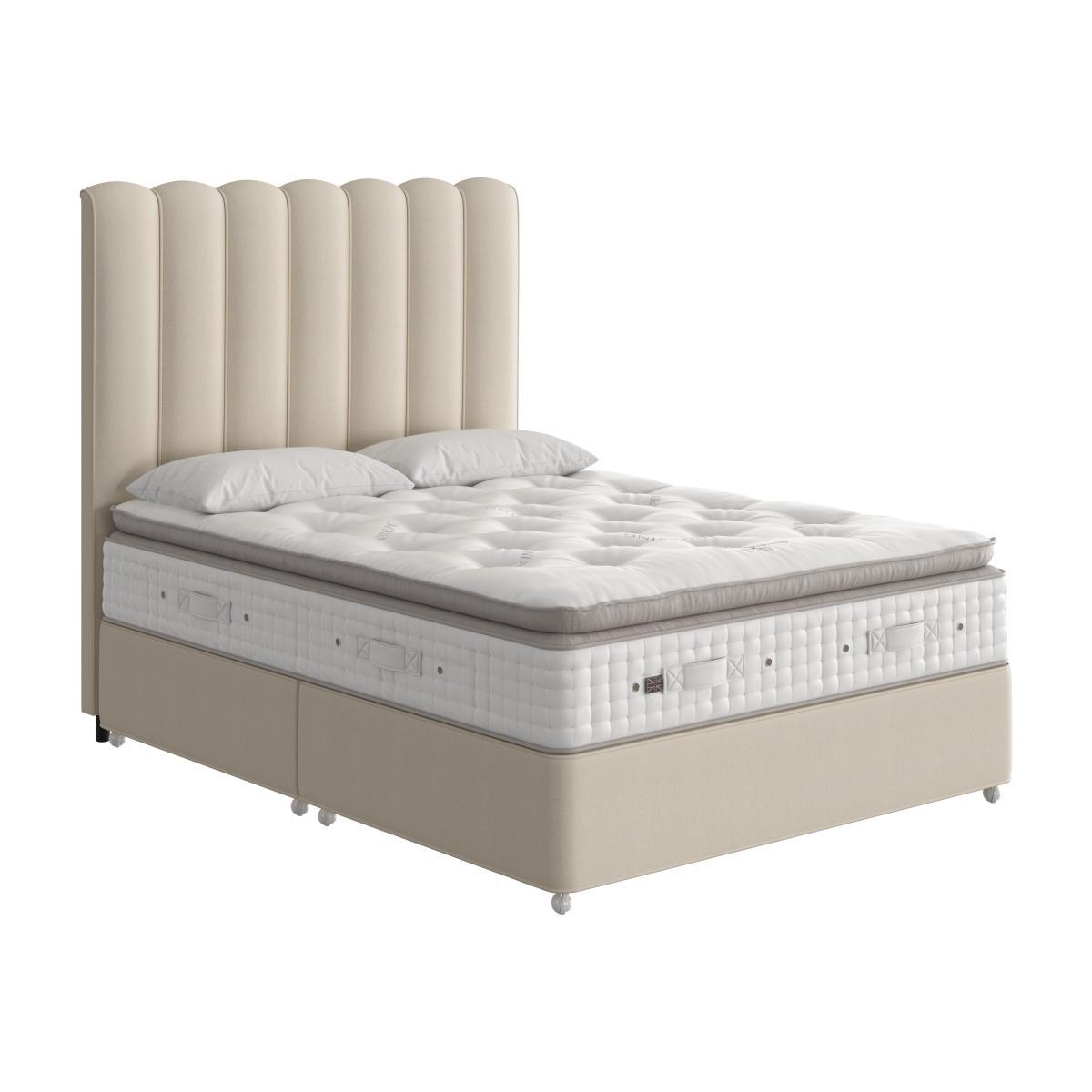 One of Vispring's first ever pillow top divan sets, this bed has to be seen to be believed. Or, better still, just snuggle down on that sumptuous pillow top with two layers of micro springs and surrender to comfort. Why you’ll love it. Exquisite divan set features one of Vispring’s very first pillow top mattresses. Opulent comfort crafted to exceptionally high standards. Outstanding support thanks to a double layer of pocket springs – 2812 in king size. Pillow top has 2 micro spring layers and resilient fillings for softness that helps reduce sagging. Natural wool and cotton fillings are hypoallergenic. In a choice of spring tensions for personalised comfort. Wide choice of fine fabrics for the divan base. Five different optional storage drawer configurations. The range also includes a standalone mattress. Handmade to order in Britain by Vispring. Exclusively available at Furniture Village. What you need to know. Headboard shown is available seperately. Mattress type: Pocket spring. Depth: 38 cm including a 10 cm pillow top. Firmness: Soft, medium, firm; split tension available in king and super king sizes. Springs: 2812 hand-nested, six-coil steel pocket springs in king size. Pillow top: Yes, with micro springs, real Shetland wool, Airstream Memory Wool and Cocolok. Fillings: British wool, British cotton. Borders: Wool-upholstered, 4 rows of hand side-stitching, horizontal handles, air vents. Edge support: Hand side stitched to create edges that support just the same as in the middle of the bed. Cover: 100% viscose damask ticking. Requires turning: No. Base type: Traditional fully pocket sprung platform base; 950 pocket springs in king size. Sizes: Double, king, super king, super king zip and link. Mattress care: Air for 4 hours before using to remove any odour. Allow at least 4 hours for springs to settle and for mattress to attain its full size. Indentations caused by settlement of fillings or body weight are normal and are not considered defects. If used on a slatted bed frame, slats must be no more than 7 cm apart. Rotate regularly.