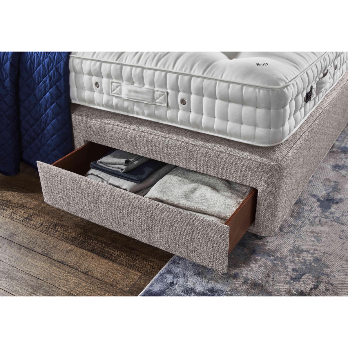 For years of guaranteed comfort, choose Vispring. The handcrafted Vispring Elite combines Vispring’s pioneering vanadium steel springs with cooling, moisture wicking fillings for an all-natural, deeply comfortable night’s sleep. The luxurious mattress fillings include platinum certified British fleece wool and cotton layered around a honeycomb of vanadium springs in individual calico pockets. The pocket sprung bases are beautifully upholstered in a choice of fine fabrics, with optional drawer storage. Surrender to the unparalleled comfort of a Vispring bed. Headboard shown available separately. Experience true luxury with the Vispring Elite pocket sprung divan set. The mattresses with all-natural and cooling fillings are paired with bases in a wide choice of colours and fabrics. Why you’ll love it Handcrafted in the UK to the highest quality. In a choice of four comfort levels. Coir, Platinum certified British fleece wool and cotton filings. Fillings wick away moisture, for a fresher and cooler sleep. 6-turn vanadium pocket springs offer responsive support. High quality ticking, hand tufted with 2 rows of hand side-stitching. Strong, wool-upholstered borders with air vents and handles. Drawer storage options are available. Base upholstered in a choice of luxury fabrics. What you need to know Mattress type: Pocket spring. Mattress depth: 21cm + 6cm doming Mattress firmness:Soft, Medium, Firm, Extra Firm. Split tension available in King and Super King size. Mattress springs: 1254 vanadium steel, 6 turn pocket springs in king size, in calico pockets. Mattress fillings: Coir, Platinum certified British fleece wool and cotton. Mattress cover:High quality ticking. Sizes: Super king, king, double, small double, single. Requires turning: Yes. Turn with the seasons for optimum performance. Base construction: Traditional sprung platform base. Solid timber frame, FSC certified. Base springs: 600 hand nested pocket springs in king size. Base fillings: Coir, British fleece wool and cotton. Mattress care:Air for 4 hours before using to remove any odour. Allow at least 4 hours for springs to settle and for mattress to attain its full size. Indentations caused by settlement of fillings or body weight are normal and are not considered defects. Rotate regularly, turn seasonally.